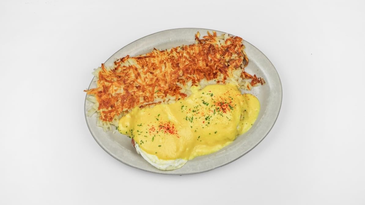 Over-easy eggs, Canadian bacon on an English muffin, topped with hollandaise sauce, served with hash browns