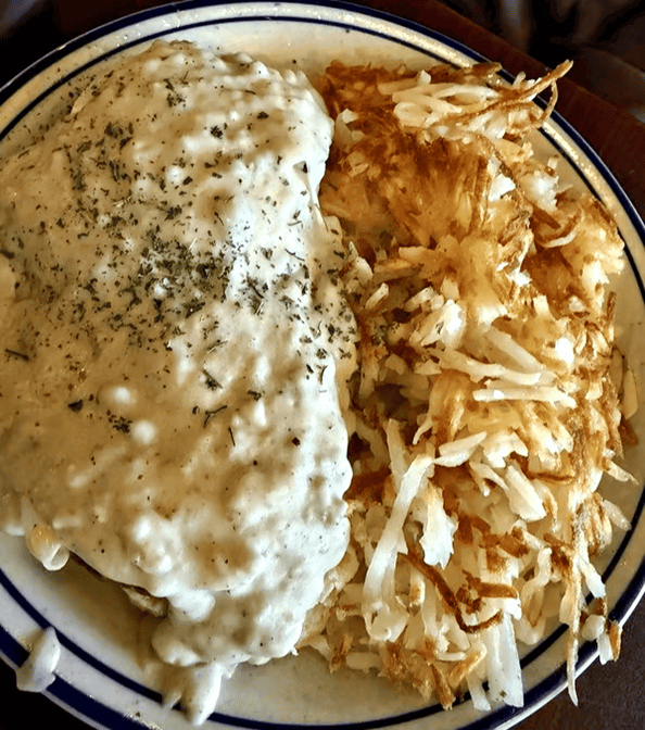 Country-fried steak topped with our sausage gravy, served with eggs, hash browns, and toast