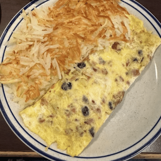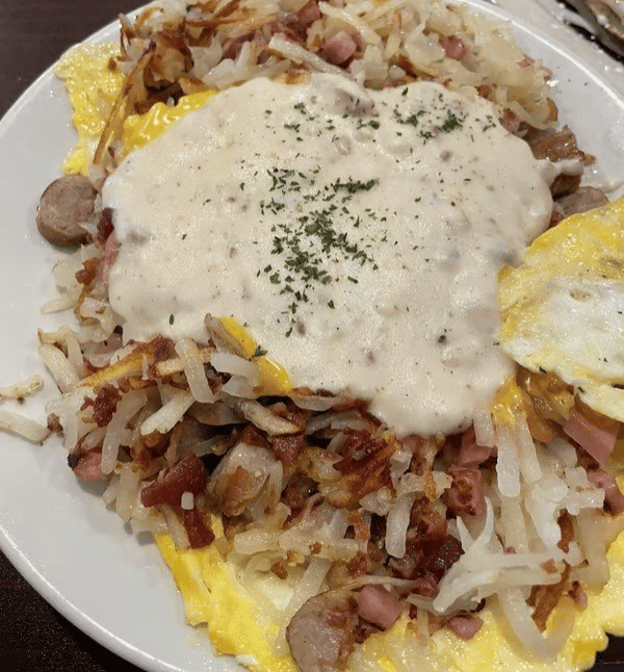 3 egg open-faced omelet stuffed with hash browns, bacon, sausage, ham, and American cheese, topped with sausage gravy