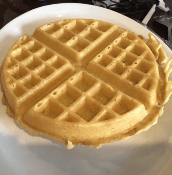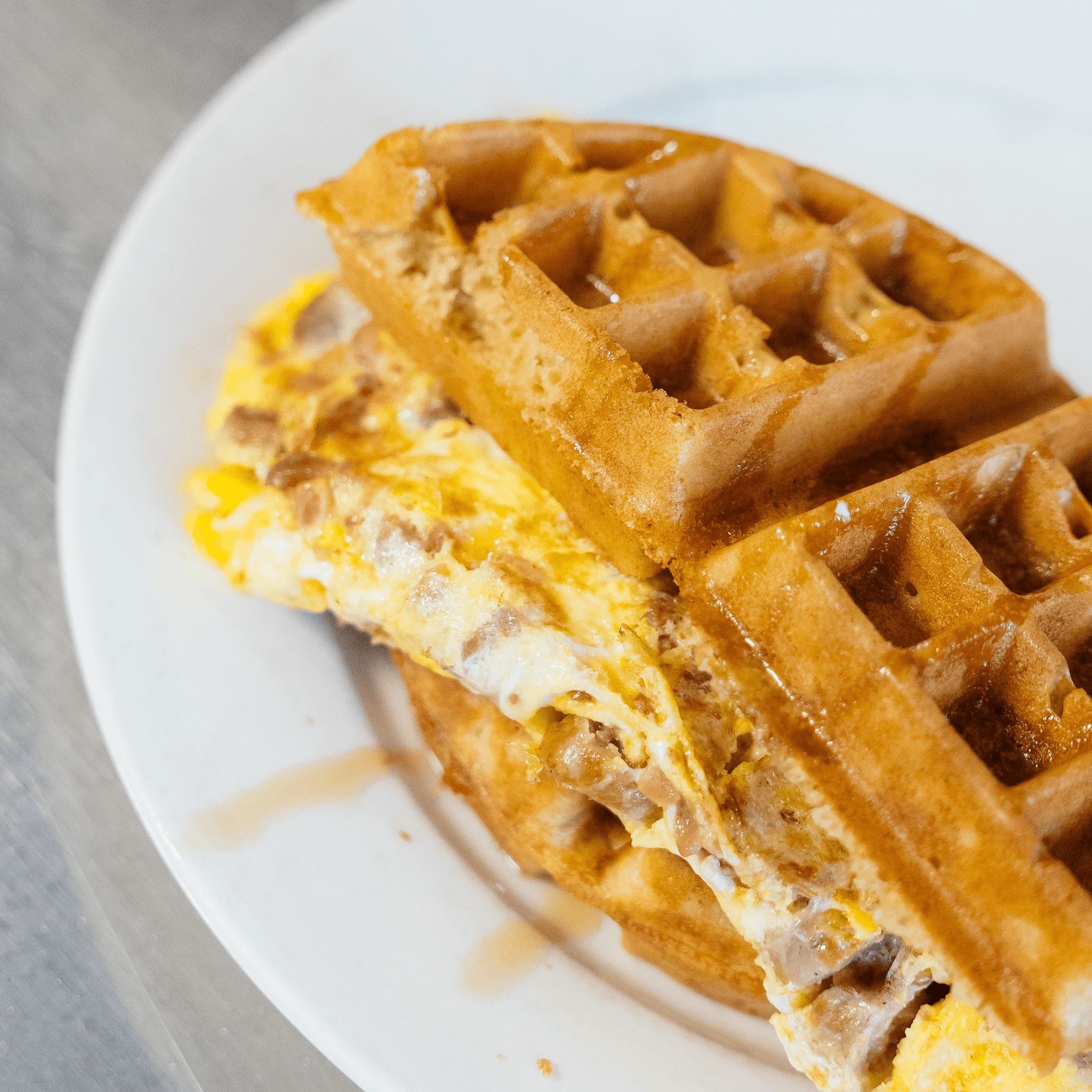 Three eggs, sausage, bacon, cheddar omelet stuffed between two halves of our famous waffle, topped with powdered sugar and lots of syrup drizzled on top