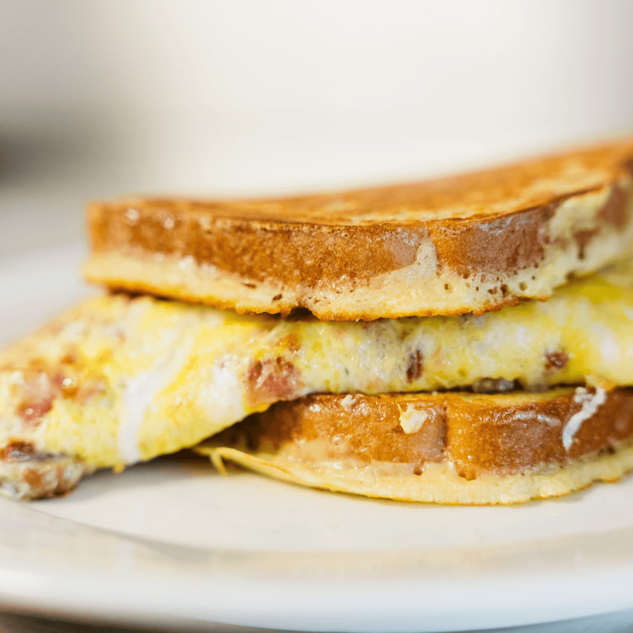 A three-egg, bacon, sausage, and cheddar cheese omelet stuffed between two slices of our French toast and covered with powdered sugar. Unbelievable!
