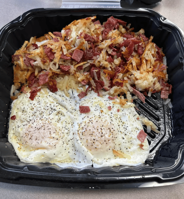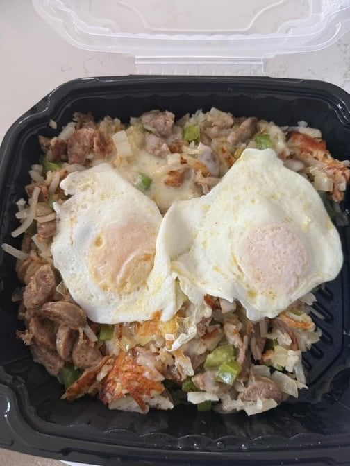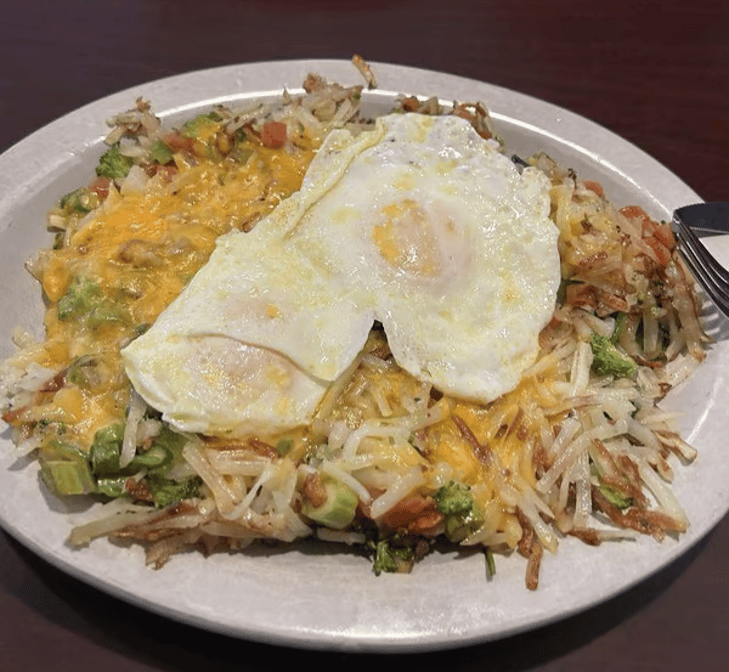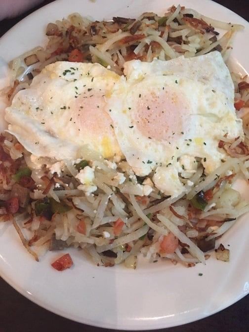 Gyro meat, onion, tomato, peppers, and feta cheese mixed with hash browns, topped with two eggs over easy