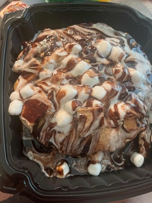 Three pancakes stuffed with chocolate chips and graham crackers, sprinkled with marshmallows, chocolate chips and graham crackers, drizzled with chocolate and white chocolate syrup.
