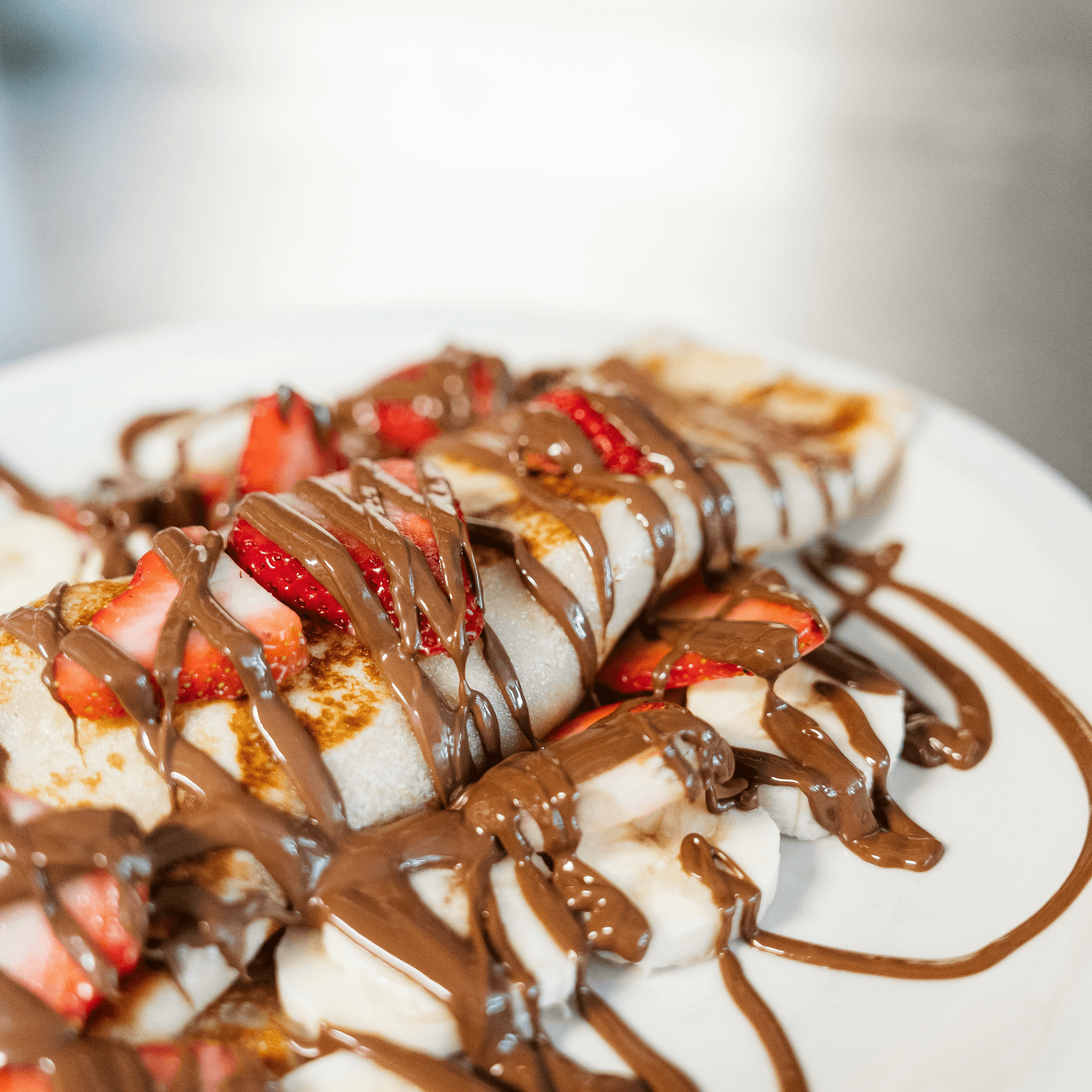 Smothered in powdered sugar and drizzled with Nutella. Garnished with fresh strawberry and whipped cream