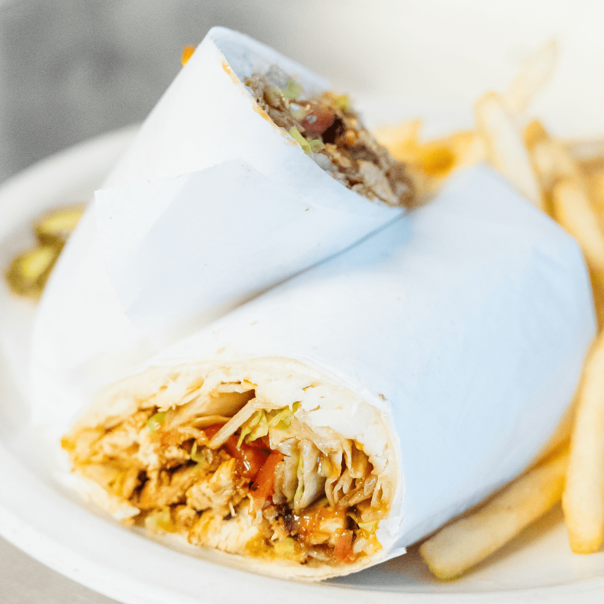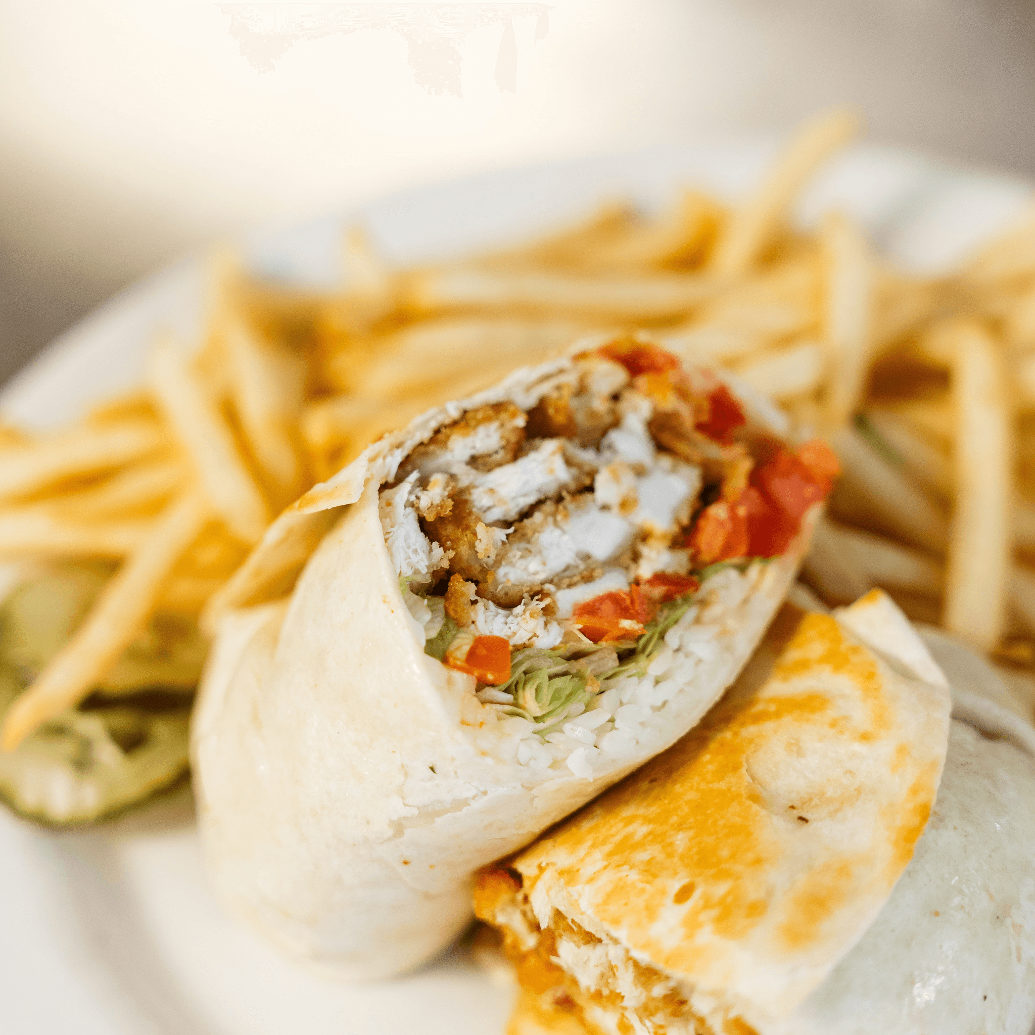 Lettuce, tomato, onion, cheddar, bang-bang sauce, on a flour tortilla