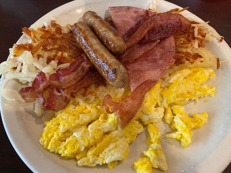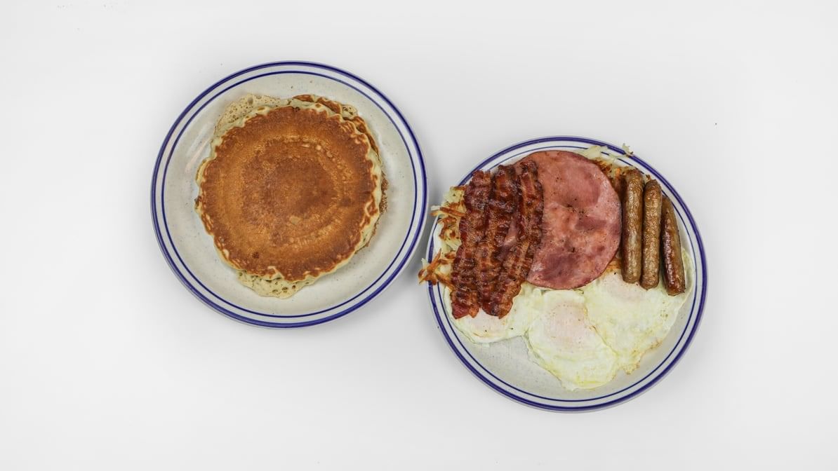 3 eggs, 3 sausages, 3 bacon, ham, hash browns, half order of pancakes, and toast