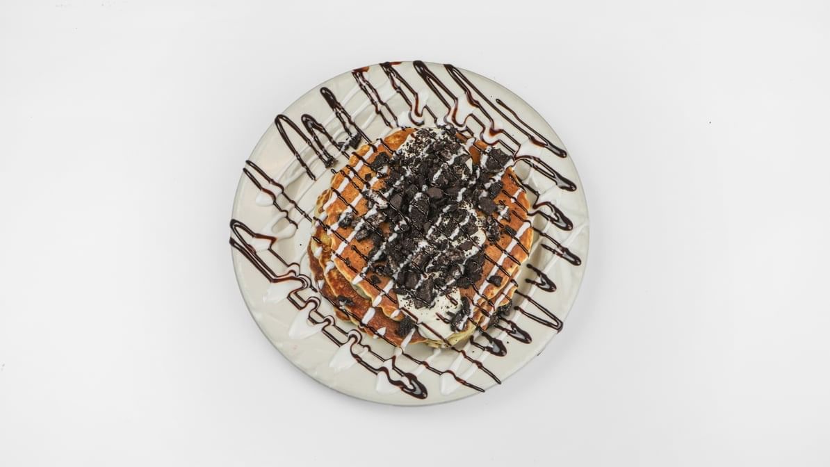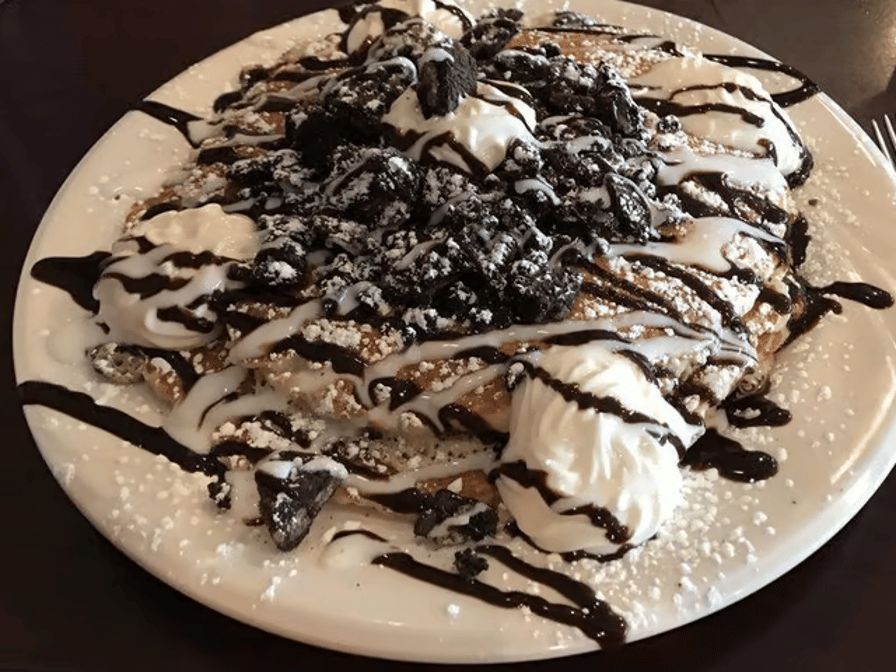 Stuffed with crumbled Oreo pieces, stacked and topped with Oreo, sweet cream cheese, chocolate, and white chocolate syrup
