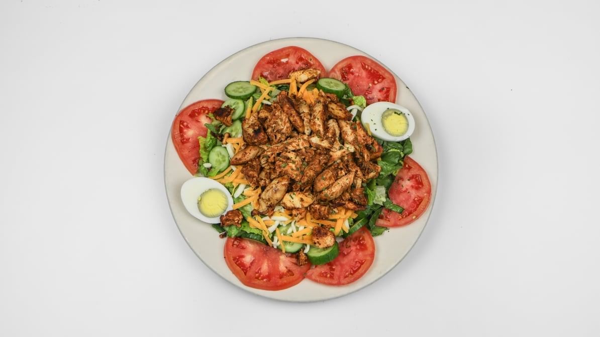 Grilled chicken, hard-boiled egg, tomato, cucumber, cheddar, and mozzarella cheese on top of romaine. Want a little kick? Ask for it buffalo style, and we will spice it up for you