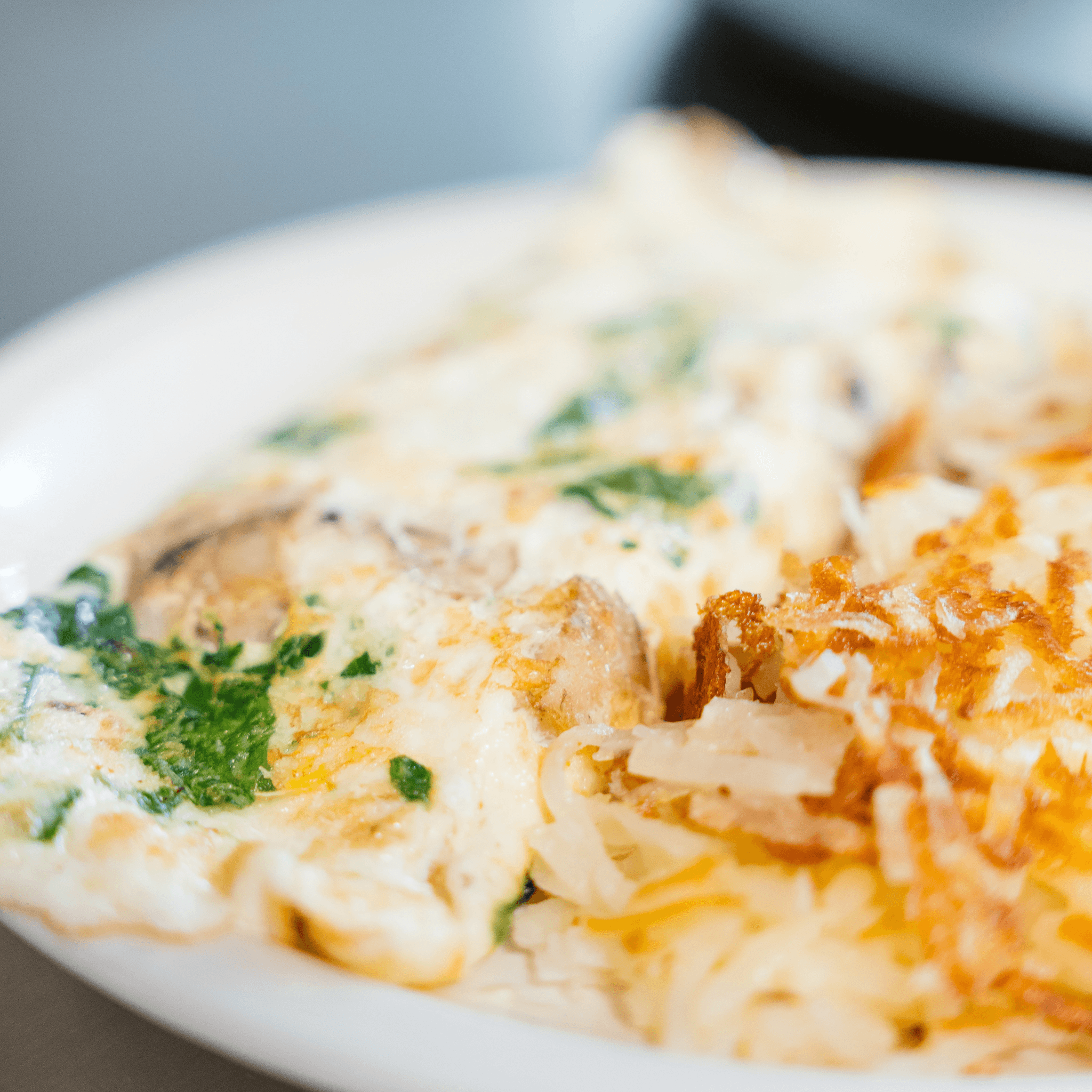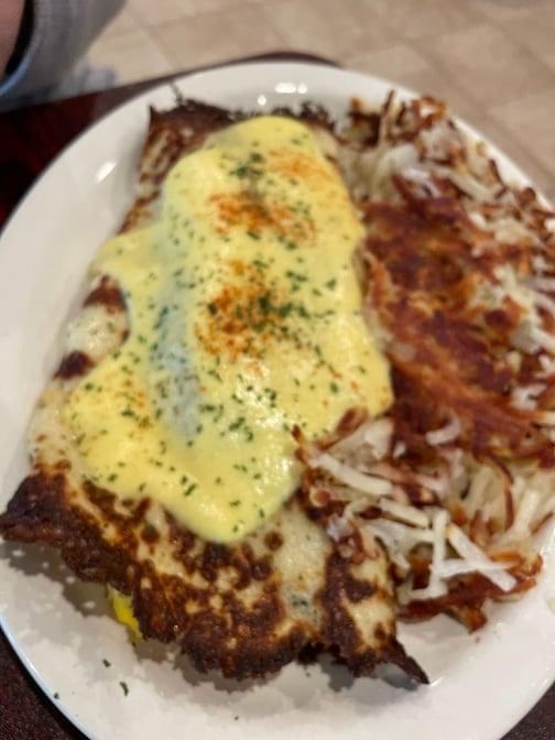 Chicken breast, mushroom, spinach, onion, cheddar cheese, stuffed in a large crepe, topped with hollandaise sauce, served with hash browns.