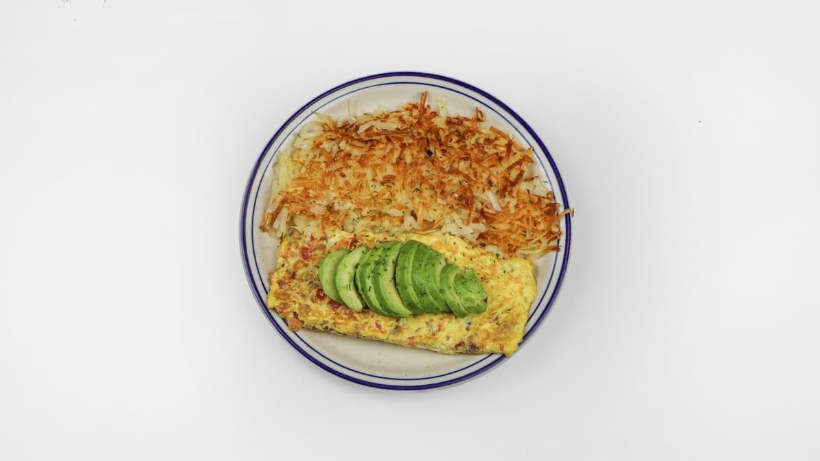 3 egg open-faced omelet stuffed with hash browns, spinach, tomato, onion, pepper, olives, mushrooms, feta, and hollandaise