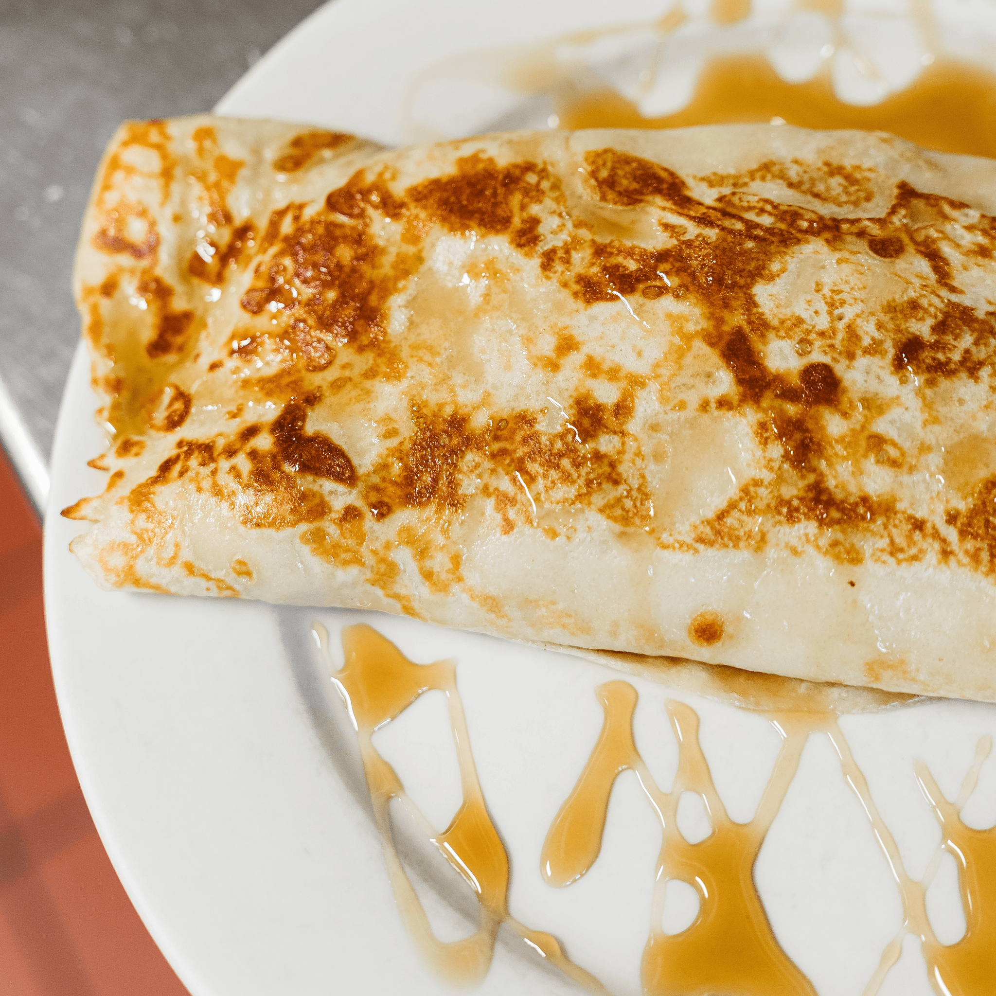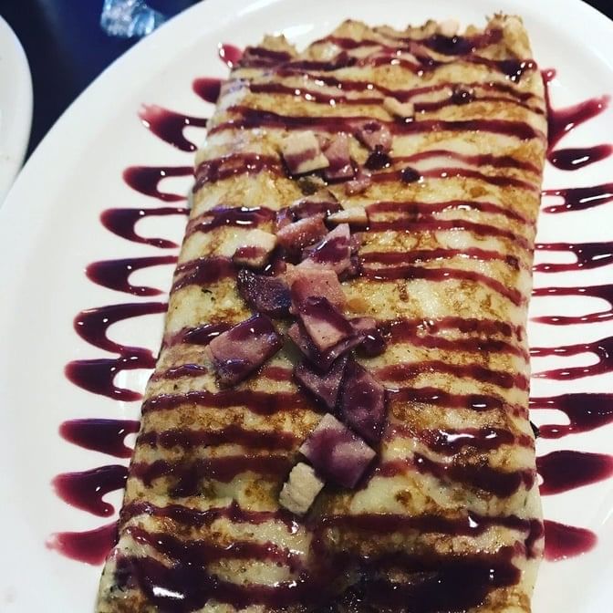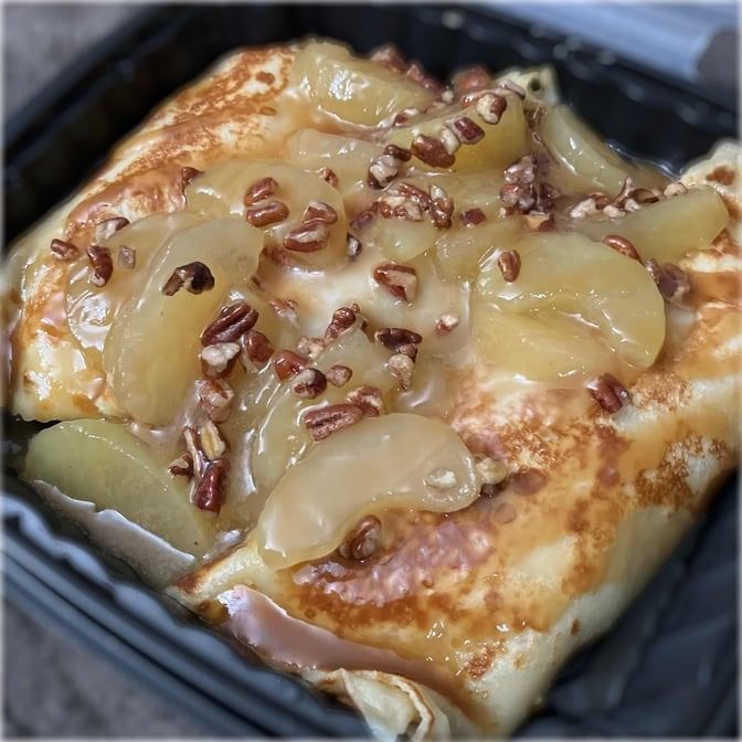 Banana, pecans, sweet cream cheese, stuffed in three small crepes, topped with Nutella, honey, and powdered sugar