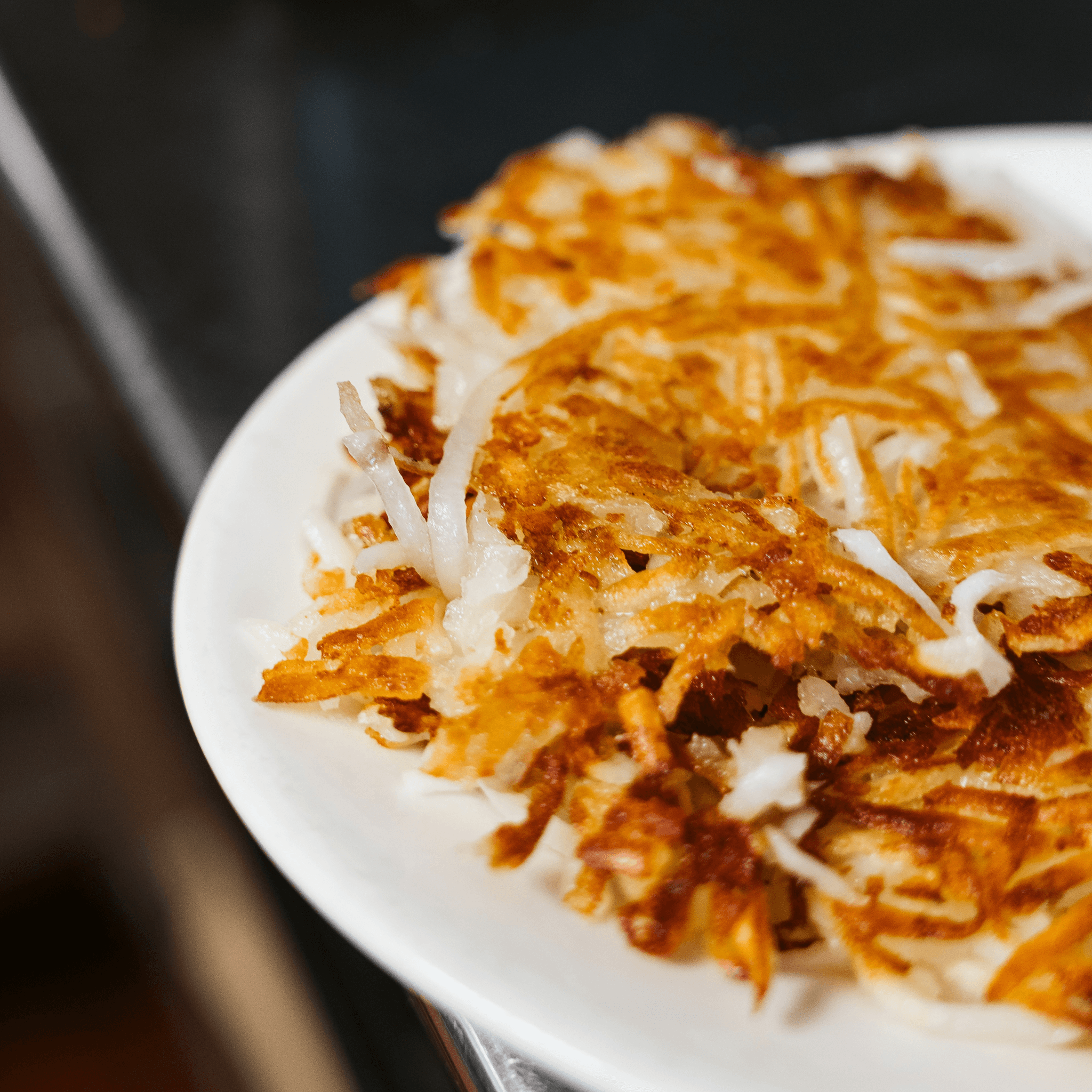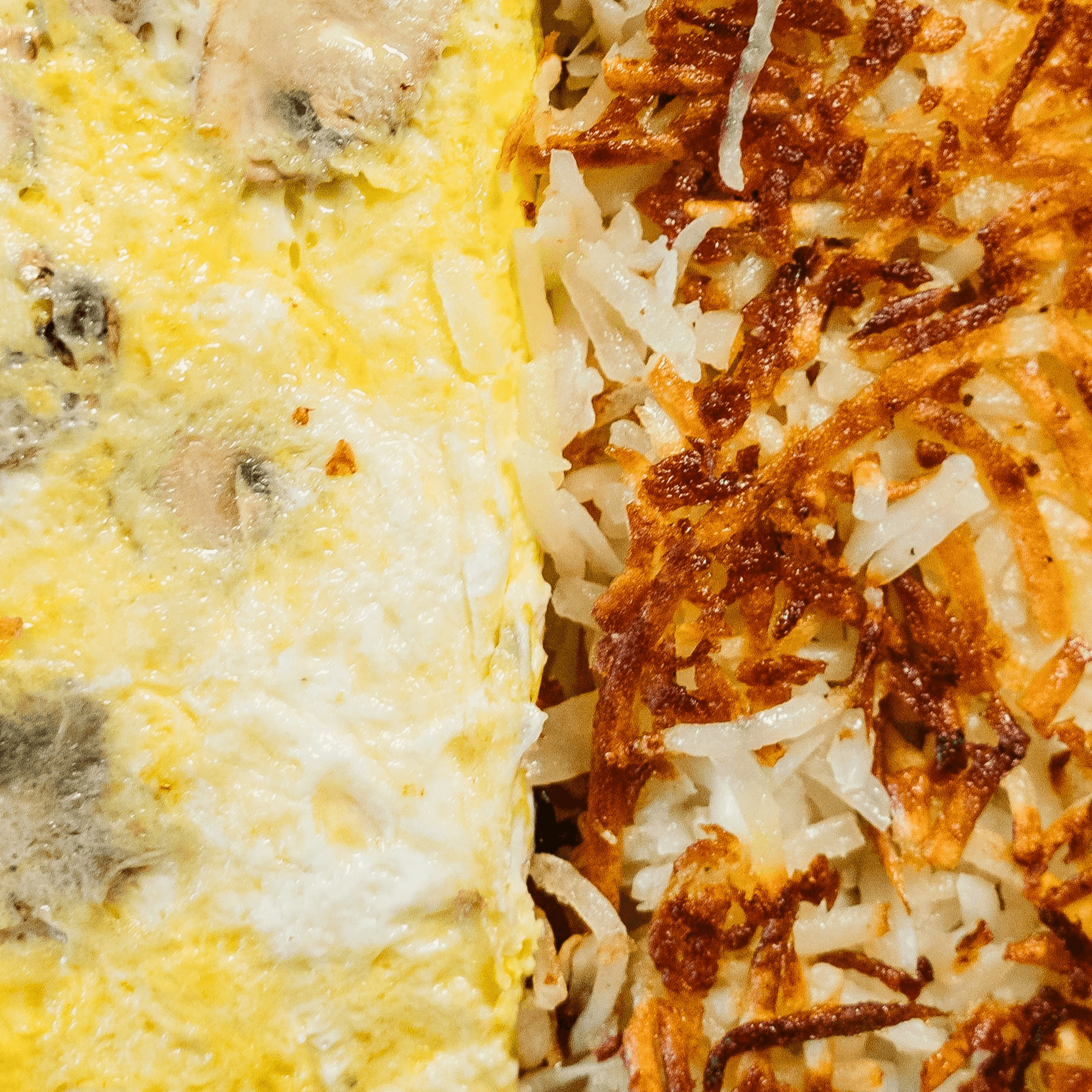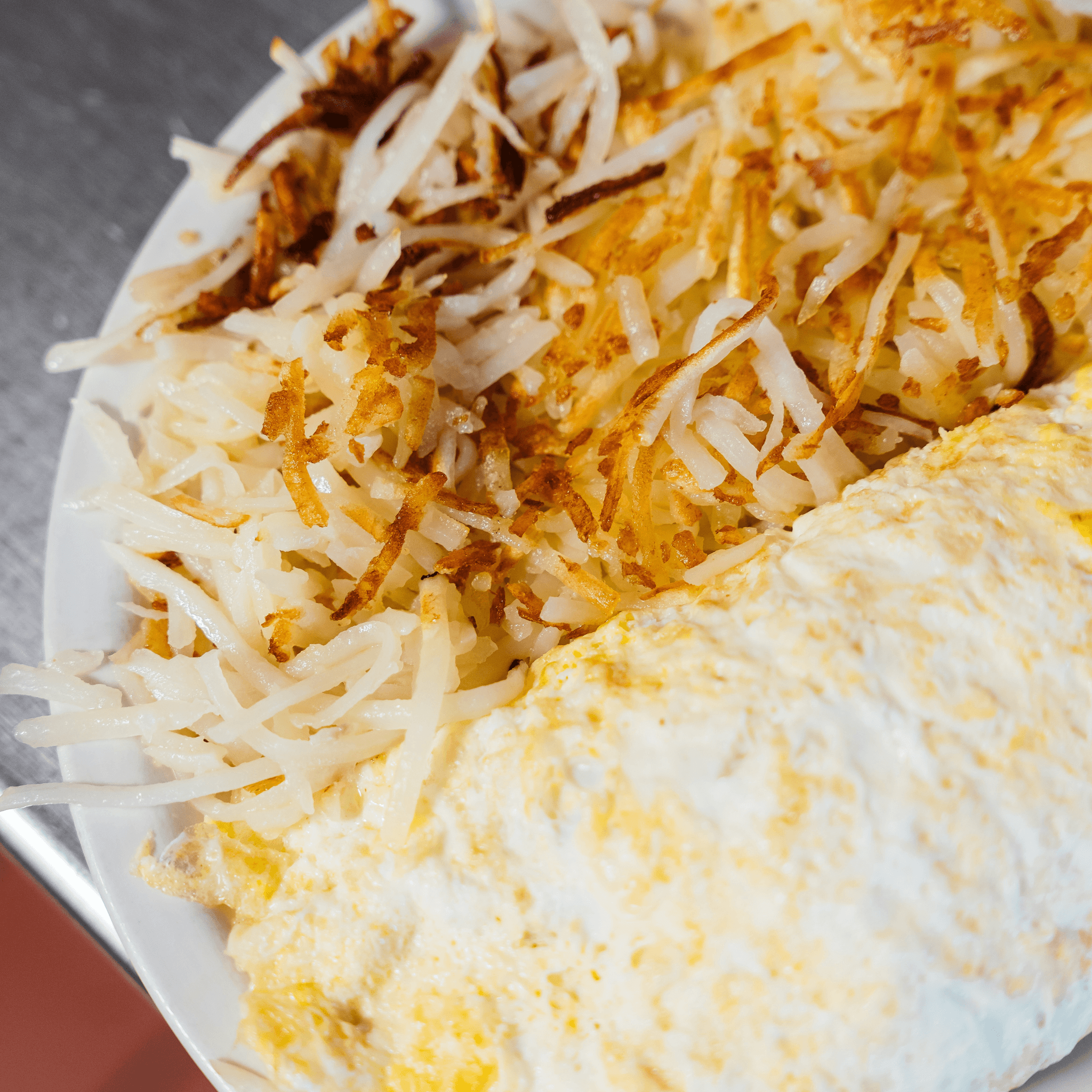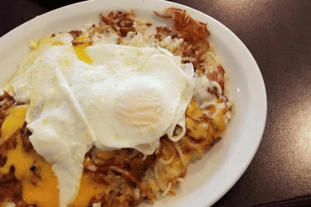 Golden hash browns loaded with cheddar and mozzarella cheese, topped with two eggs over easy