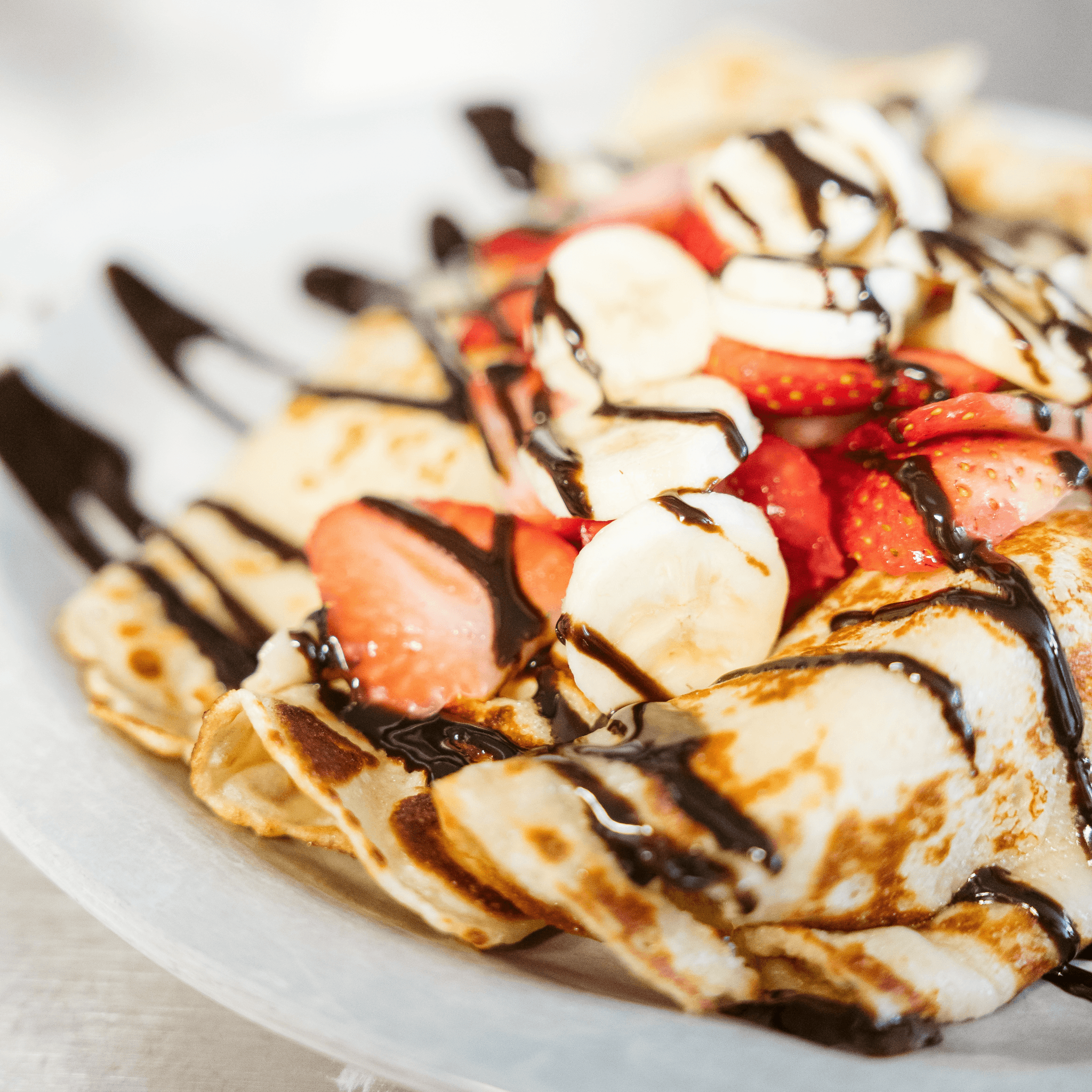 One large crepe stuffed with fresh strawberries, bananas, and sweet cream cheese, topped with Nutella and garnished with more strawberries and bananas