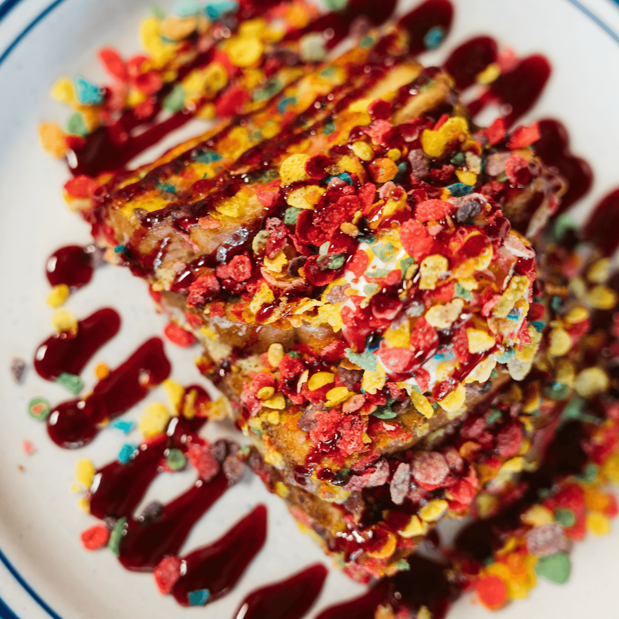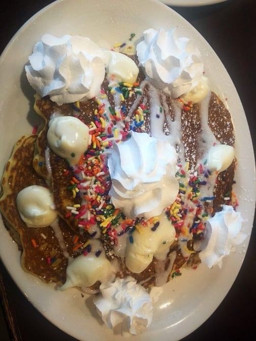 Three pancakes stuffed with sprinkles and topped with sweet cream cheese, lots of sprinkles, and vanilla syrup
