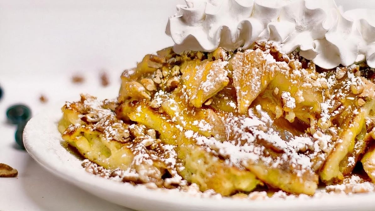Three small crepes stuffed with sweet cream cheese, apple filling, pecans, and topped with caramel and powdered sugar
