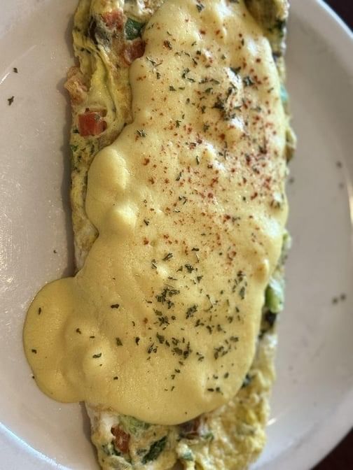 Three eggs scrambled with spinach, tomato, and mushroom, stuffed into a large crepe topped with hollandaise sauce, and served with a side of hash browns