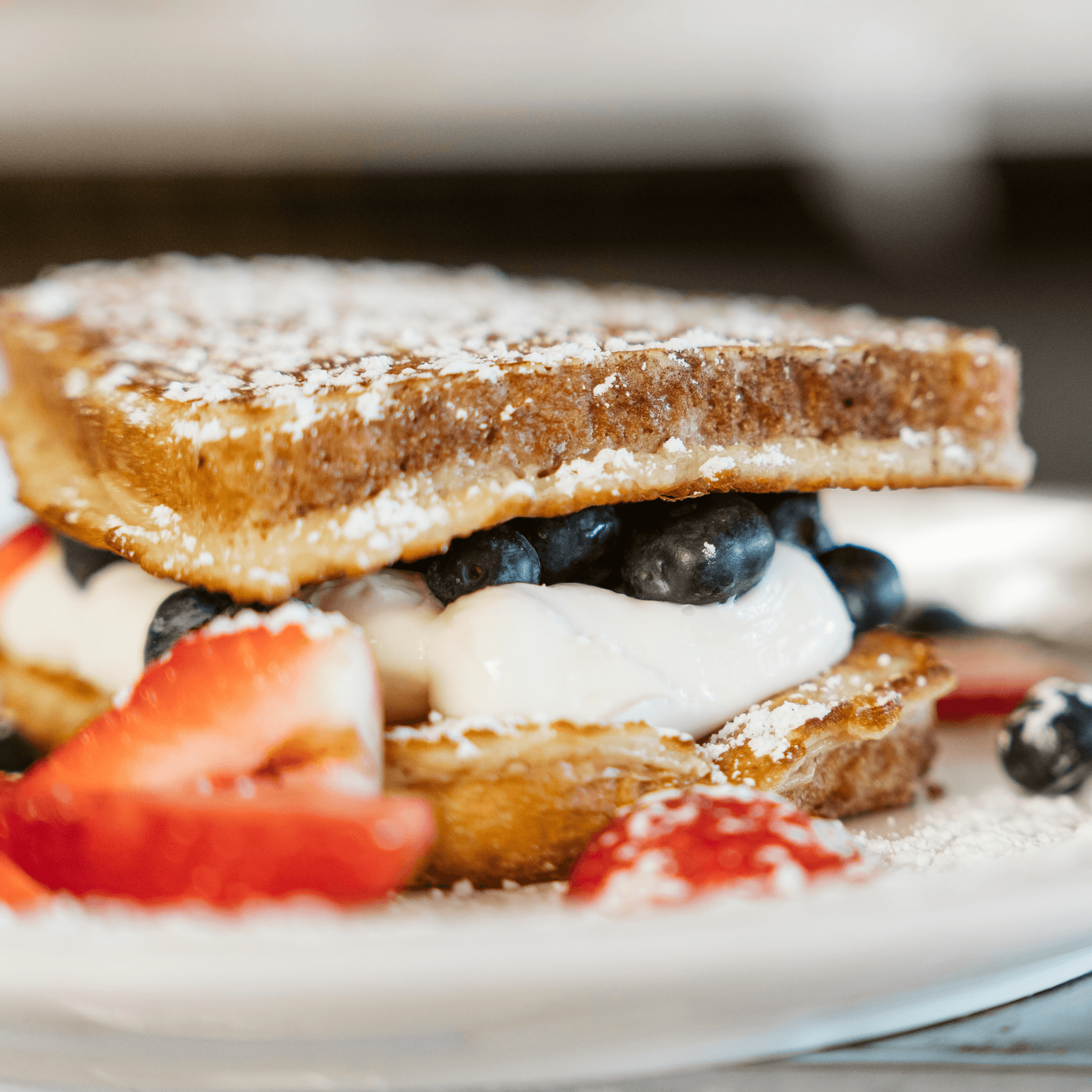 Two slices stuffed with cream cheese and your choice of fresh blueberries or strawberries, banana, or pecans. Topped with powdered sugar