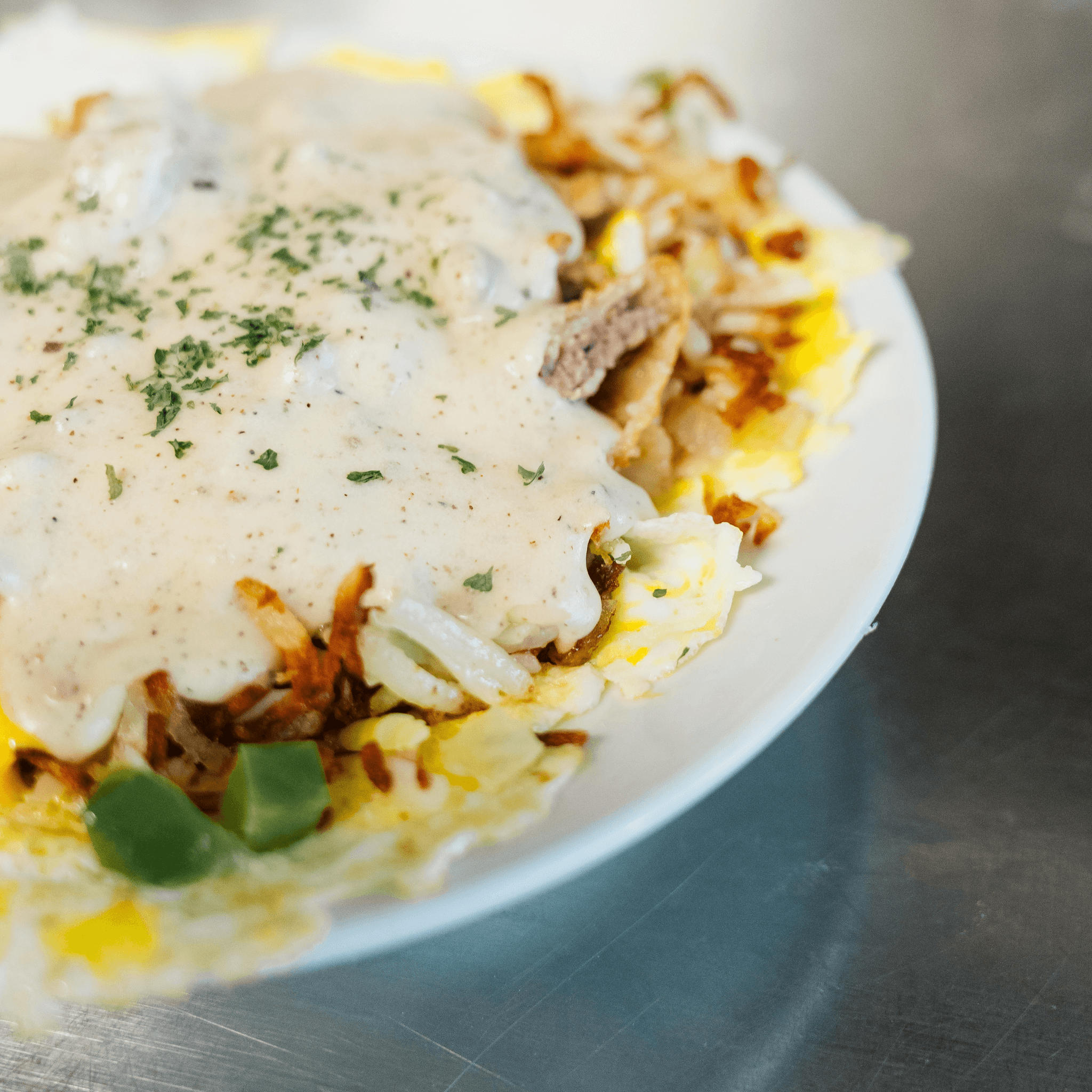 Sausage, onion, and American cheese, topped with our house-made sausage gravy