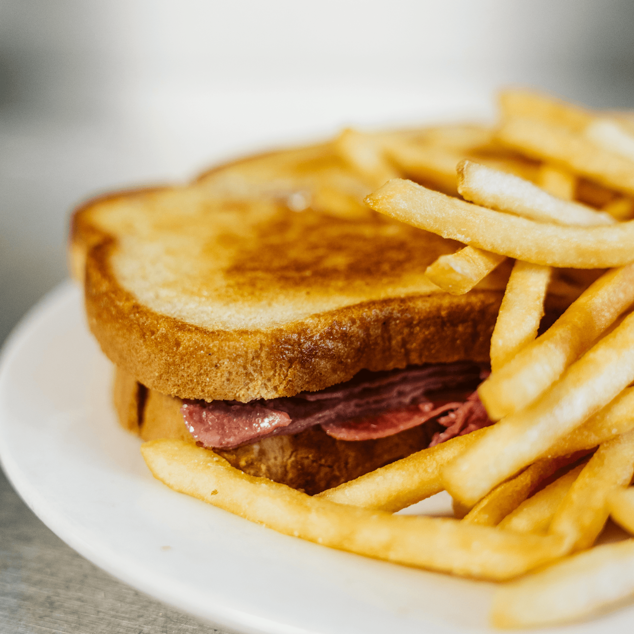 Generous portion of corned beef, sauerkraut and Swiss cheese, served on grilled rye bread