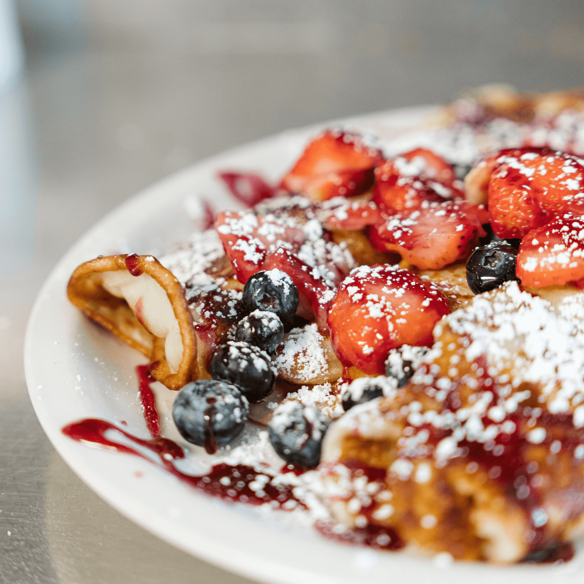 Three small crepes stuffed with fresh strawberries, blueberries, sweet cream cheese, topped with powdered sugar and melba sauce