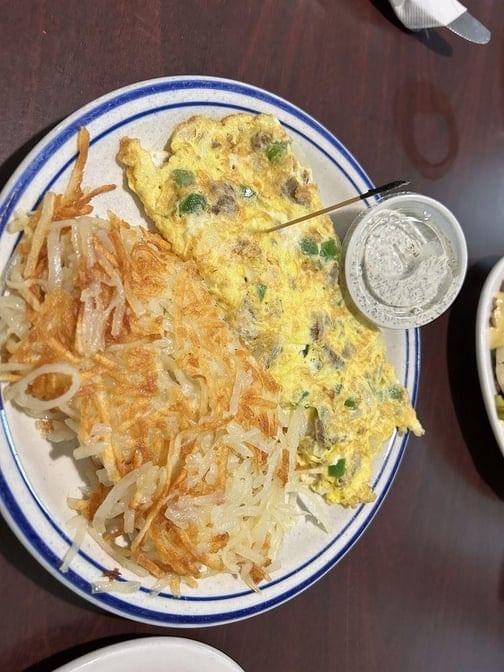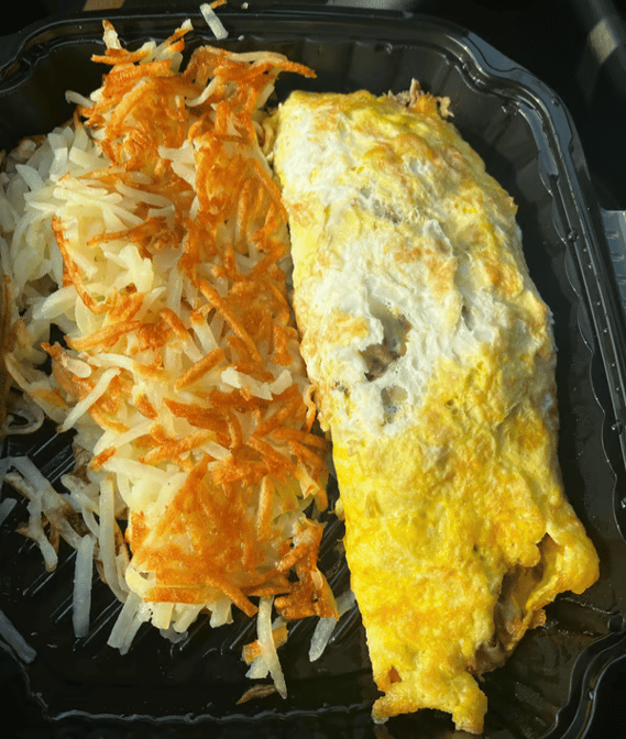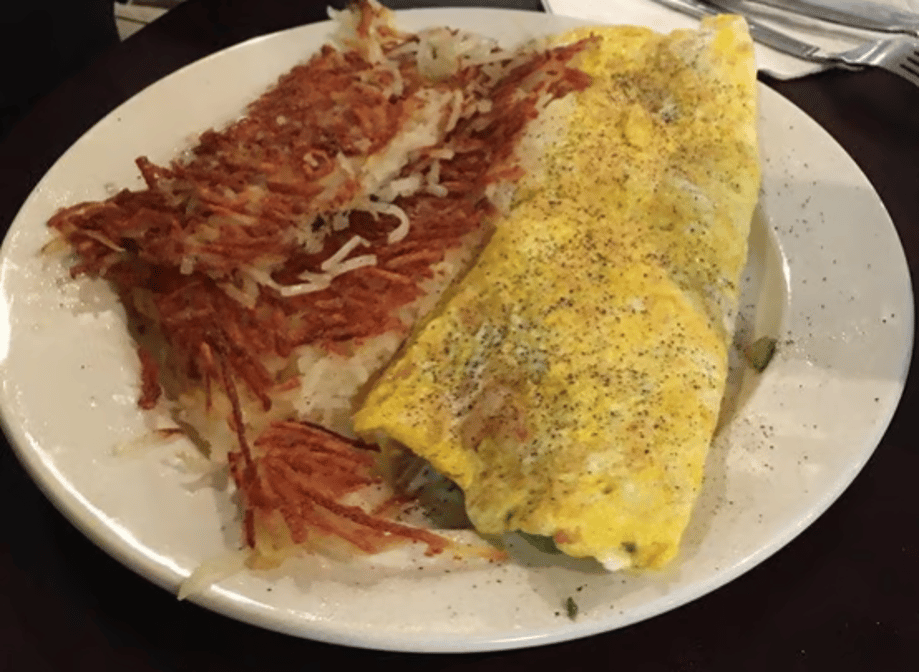 Italian sausage, peppers, onions, all sautéed and topped with mozzarella cheese, then stuffed in a three-egg omelet.