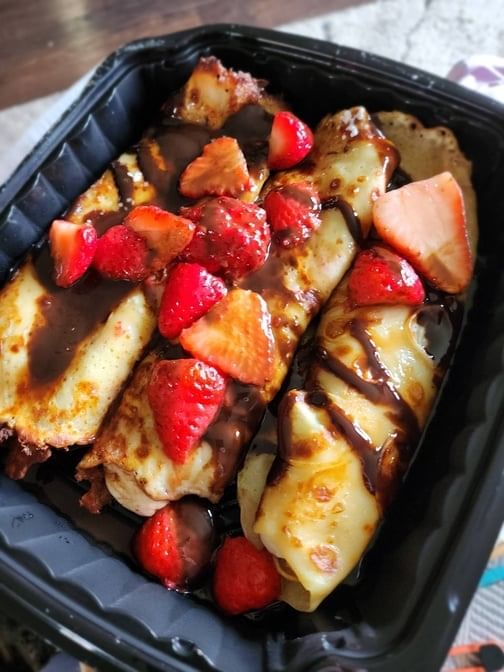 Three small crepes stuffed with sweet cream cheese, bananas, strawberries, and topped with powdered sugar and chocolate glaze