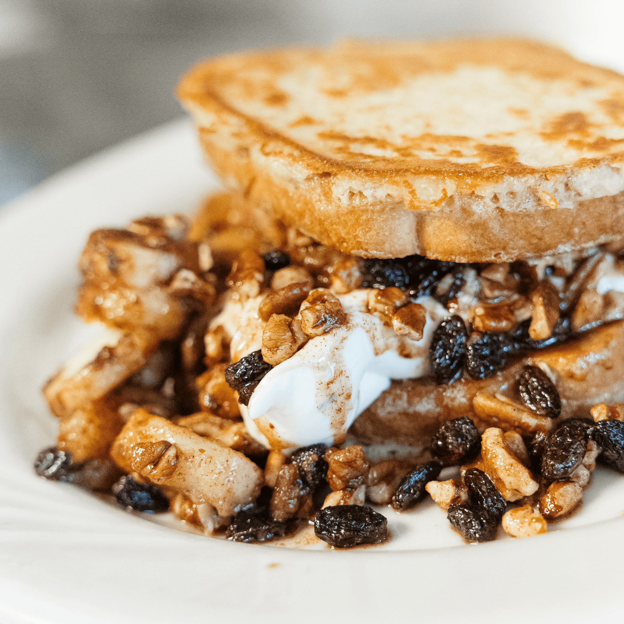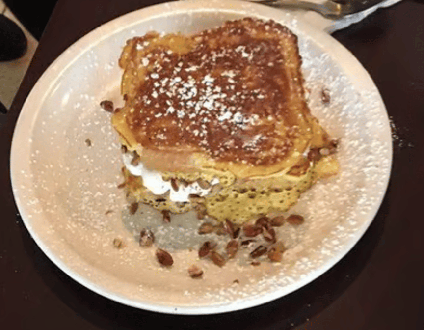 Our famous French toast stuffed with sweet cream cheese, bananas, pecans, and raisins, sautéed per order in our house-made cinnamon sugar glaze