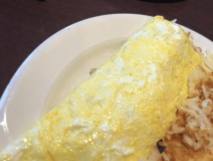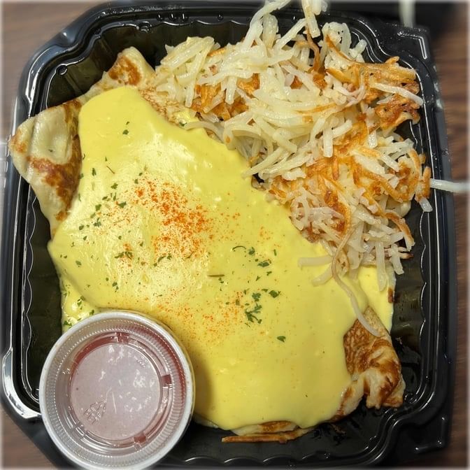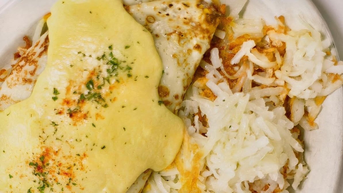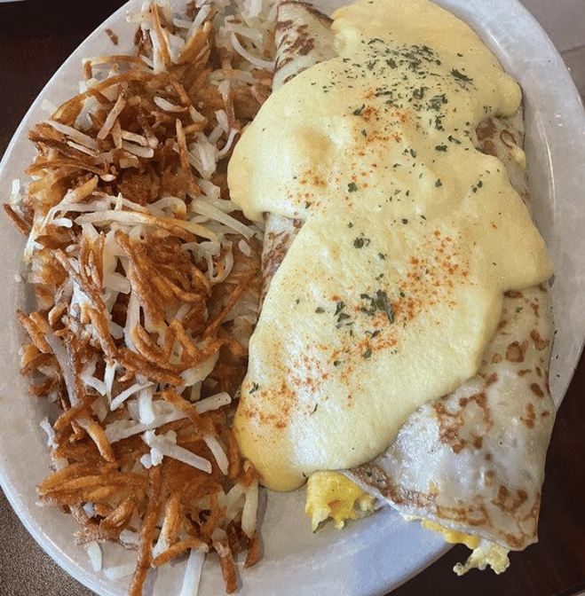 A three-egg scramble mixed with onion, mushrooms, ham, and cheddar cheese stuffed into a large crepe, topped with hollandaise sauce, and served with hash browns