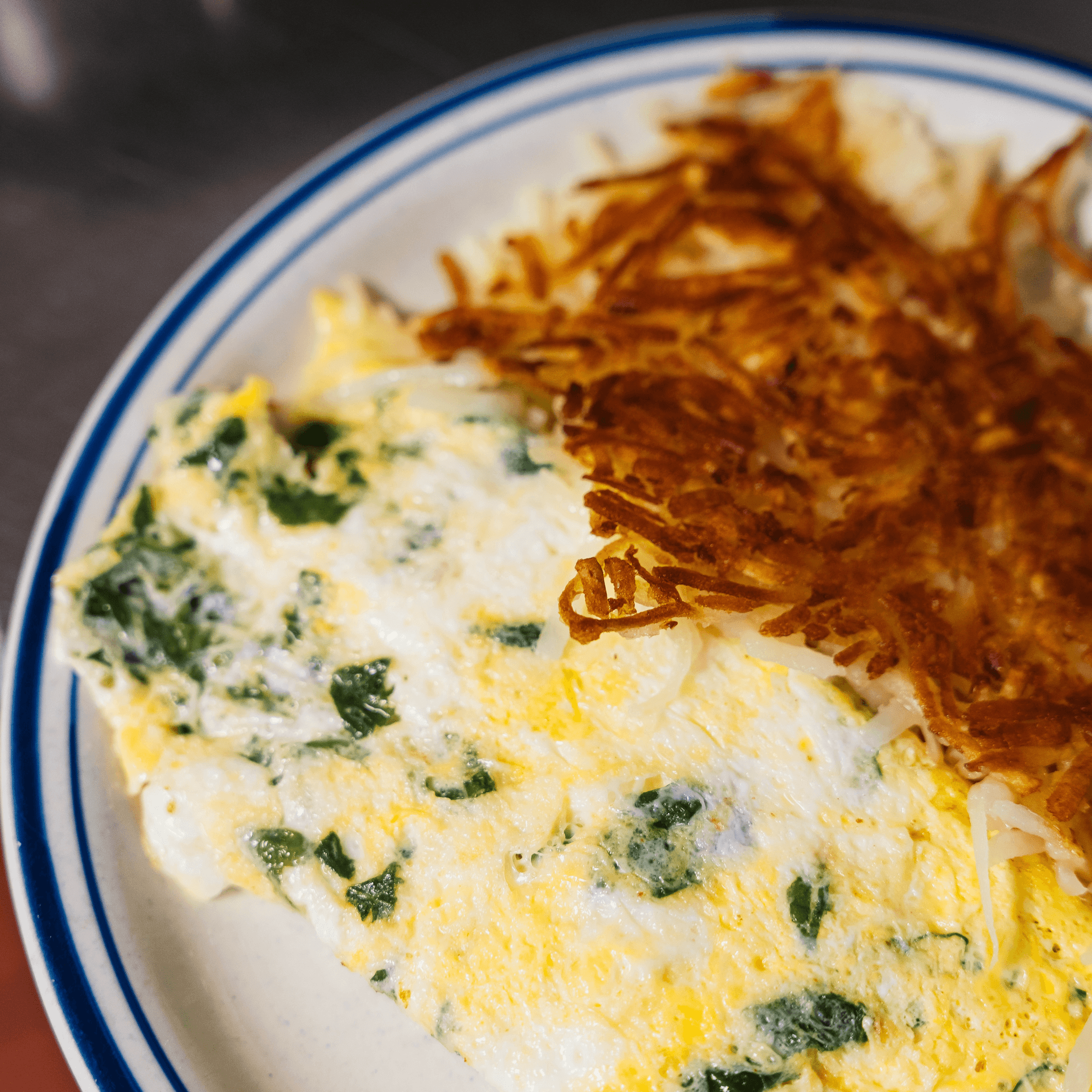Sautéed spinach, broccoli, peppers, onions, tomato, and asparagus, atop a bed of crispy hash browns loaded with cheddar cheese and two eggs over easy on top