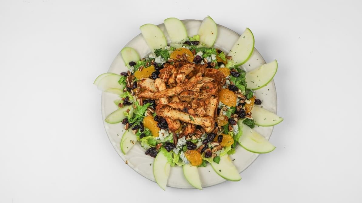 A flavor explosion featuring apples, mandarin oranges, dried cranberries, blue cheese, and pecans blended together with romaine and topped with chicken breast, then served with a balsamic vinaigrette