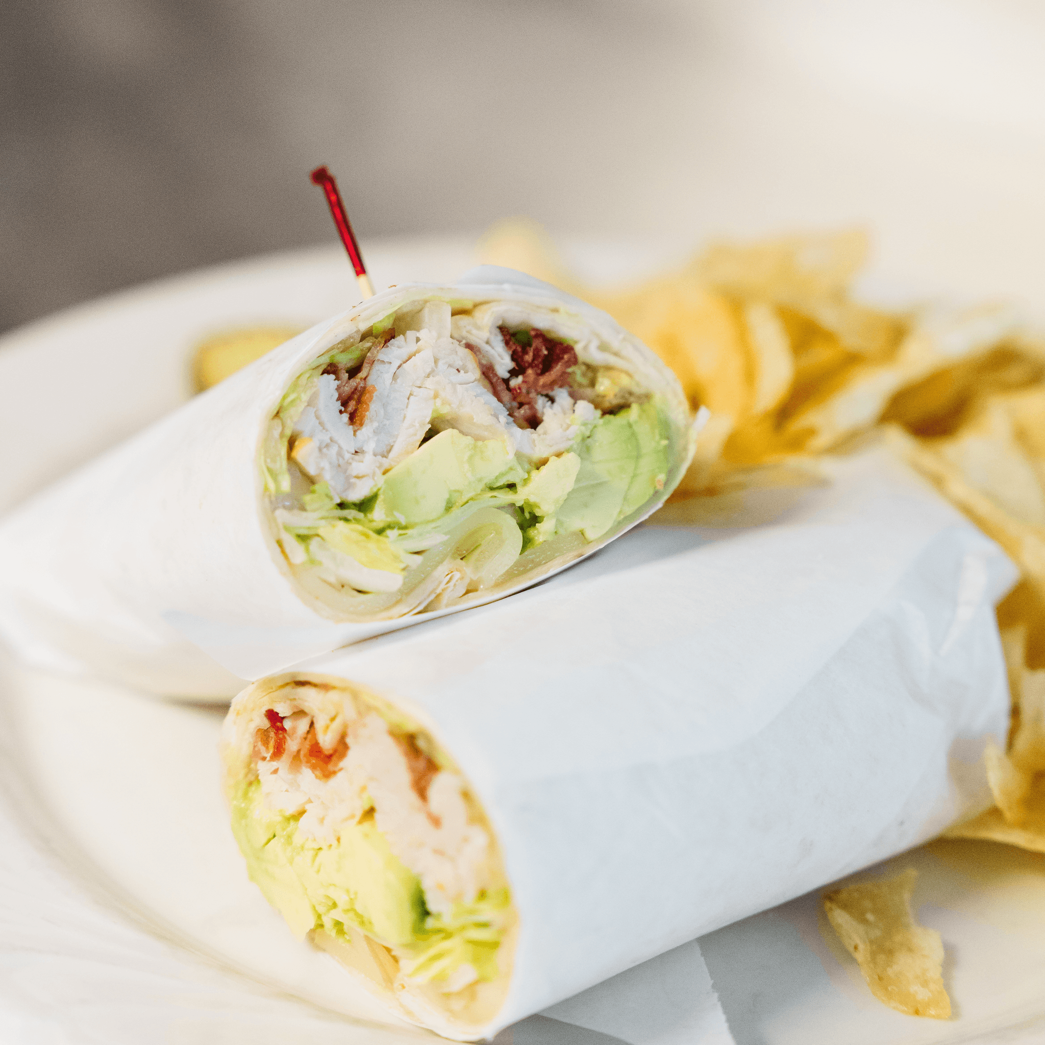 Lettuce, tomato, corn, red onion, avocado, and cheddar in a flour tortilla. We recommend honey mustard
