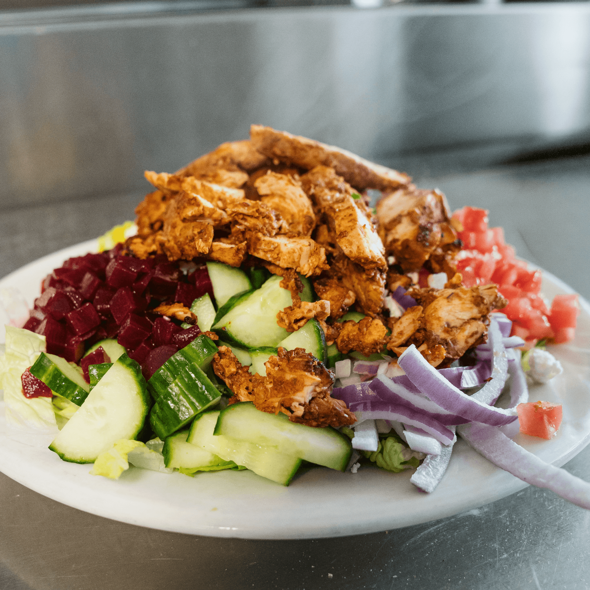 Tomato, green pepper, onion, feta, beets, banana peppers, Kalamata olives, and cucumber, served atop a bed of romaine. Add chicken or gyro meat for an additional charge