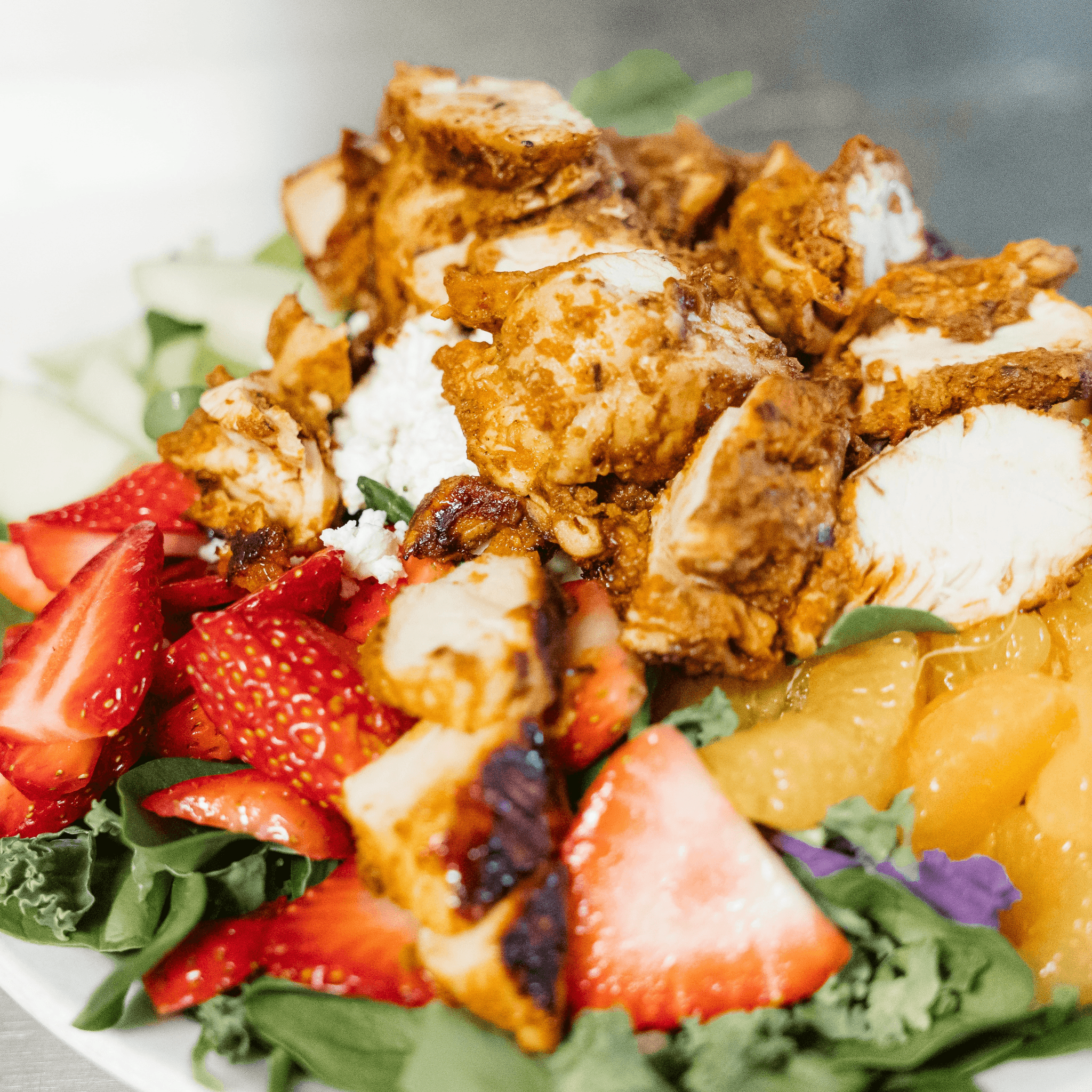 Fresh spinach and kale topped with strawberries, mandarin oranges, apples, dried cranberries, and feta cheese, topped with grilled chicken breast