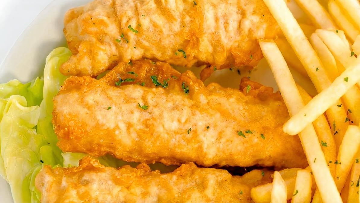 Three pieces of battered fish fried, served with French-fried potatoes and a side of tartar sauce