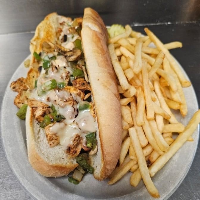Grilled Chicken sautéed with onions, peppers, cheddar cheese, BBQ sauce served on a sub bun with shredded lettuce, diced tomatoes and served with kettle chips