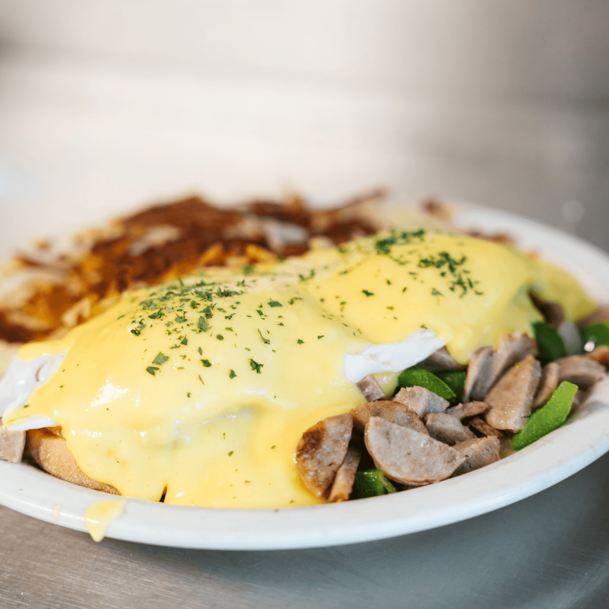 Italian sausage, peppers, onions, grilled atop an English muffin, topped with over-easy eggs, and hollandaise sauce