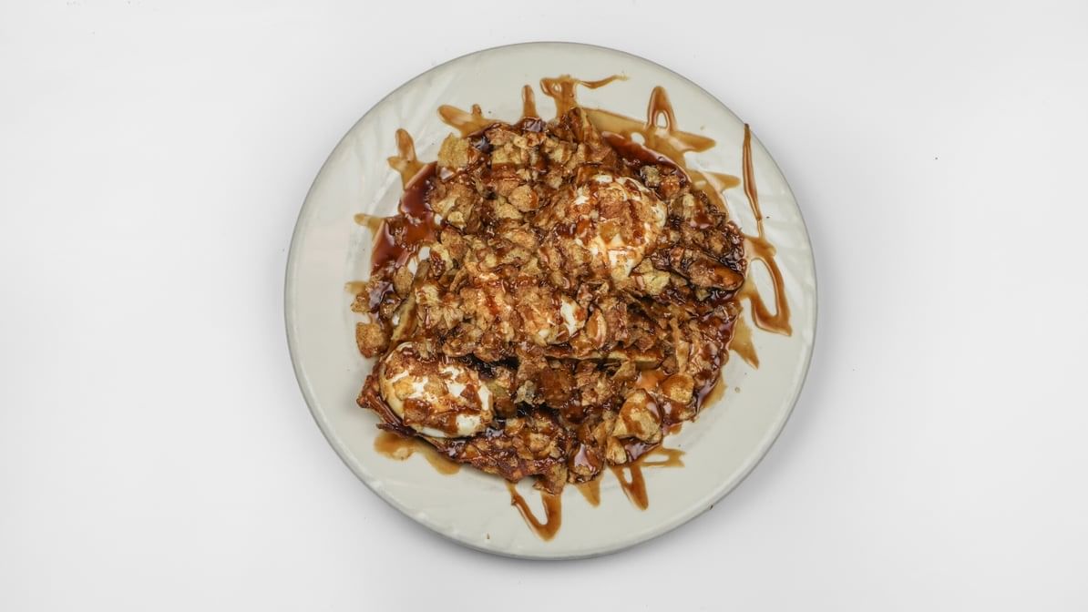 A must try! Our signature French toast topped with sweet cream cheese, our Kettle chips, cinnamon sugar blend, and cinnamon syrup