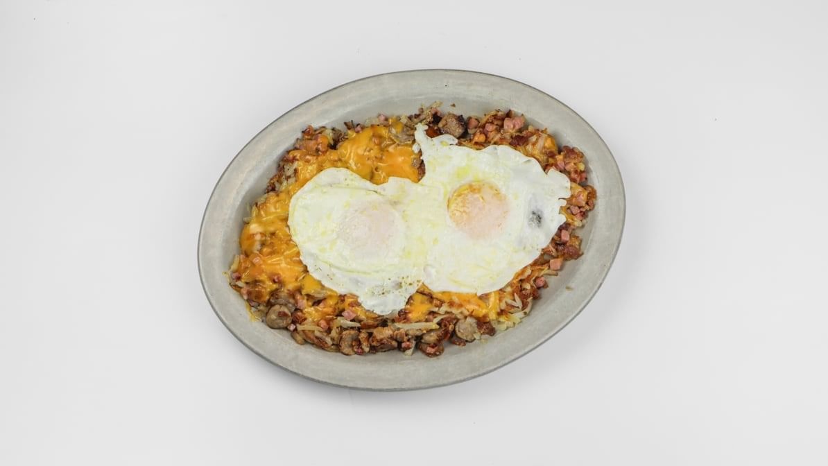 Hash browns loaded with bacon, sausage, ham, cheddar cheese, and topped with two eggs over easy