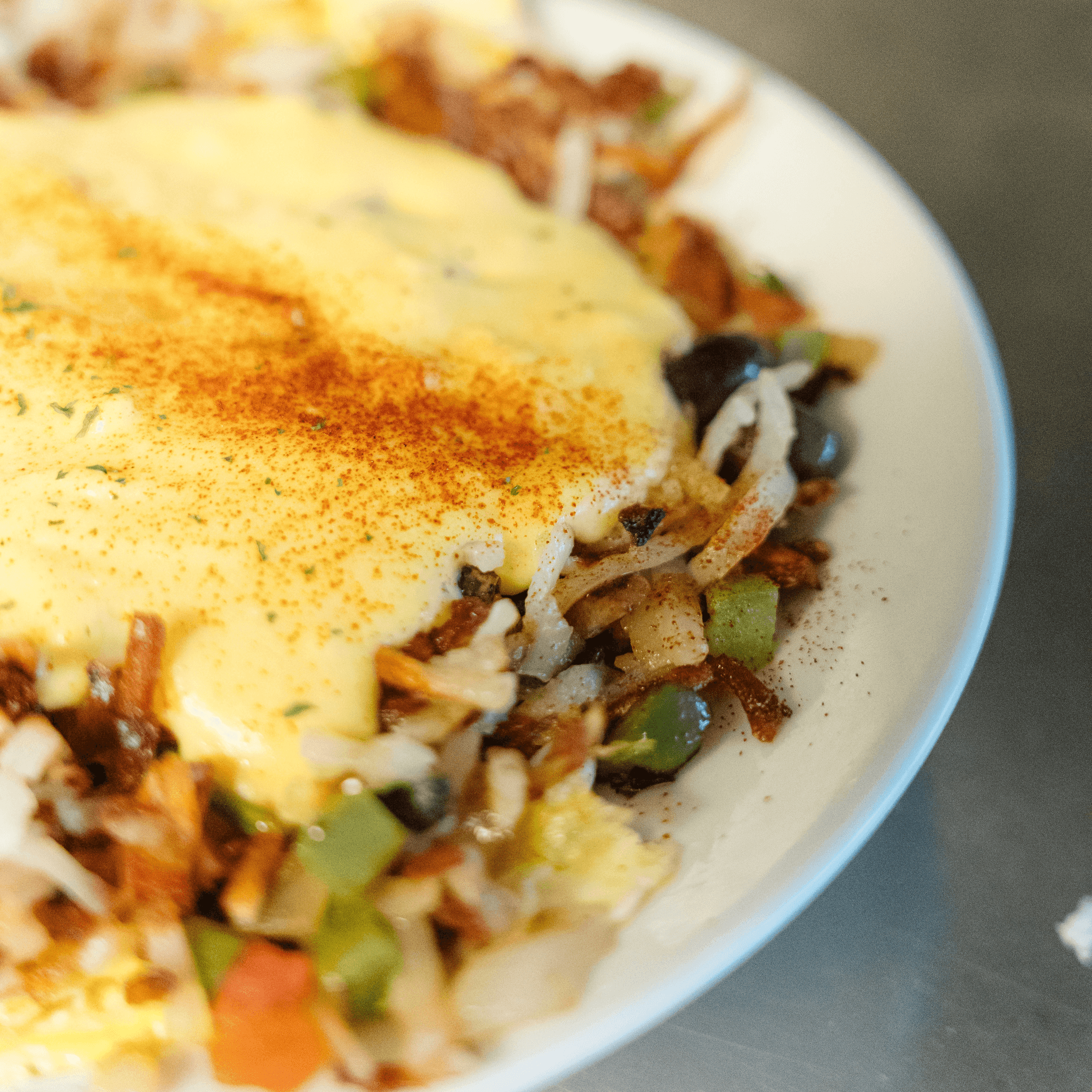 3 egg open-faced omelet stuffed with hash browns, bacon, onion, tomato, peppers, American cheese, and sausage gravy