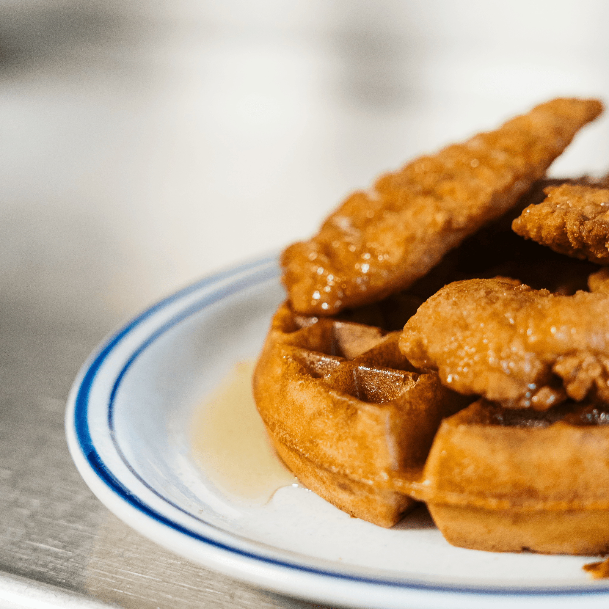 Lots of fried chicken between our signature waffle, smothered in layers of organic honey and covered in powdered sugar.