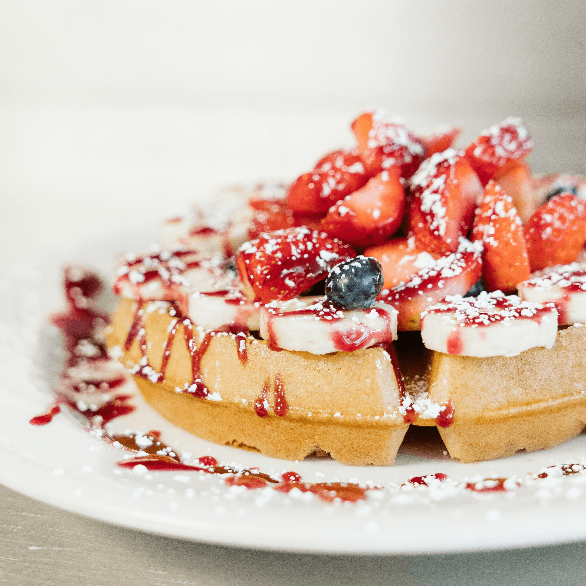 Fresh cut bananas and blueberries baked into the batter, topped with fresh strawberries, blueberries, and bananas, powdered sugar, and melba sauce