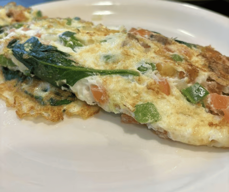 5 egg whites, onions, spinach, peppers, mushrooms, tomato, broccoli, and mozzarella cheese served with tomato slices