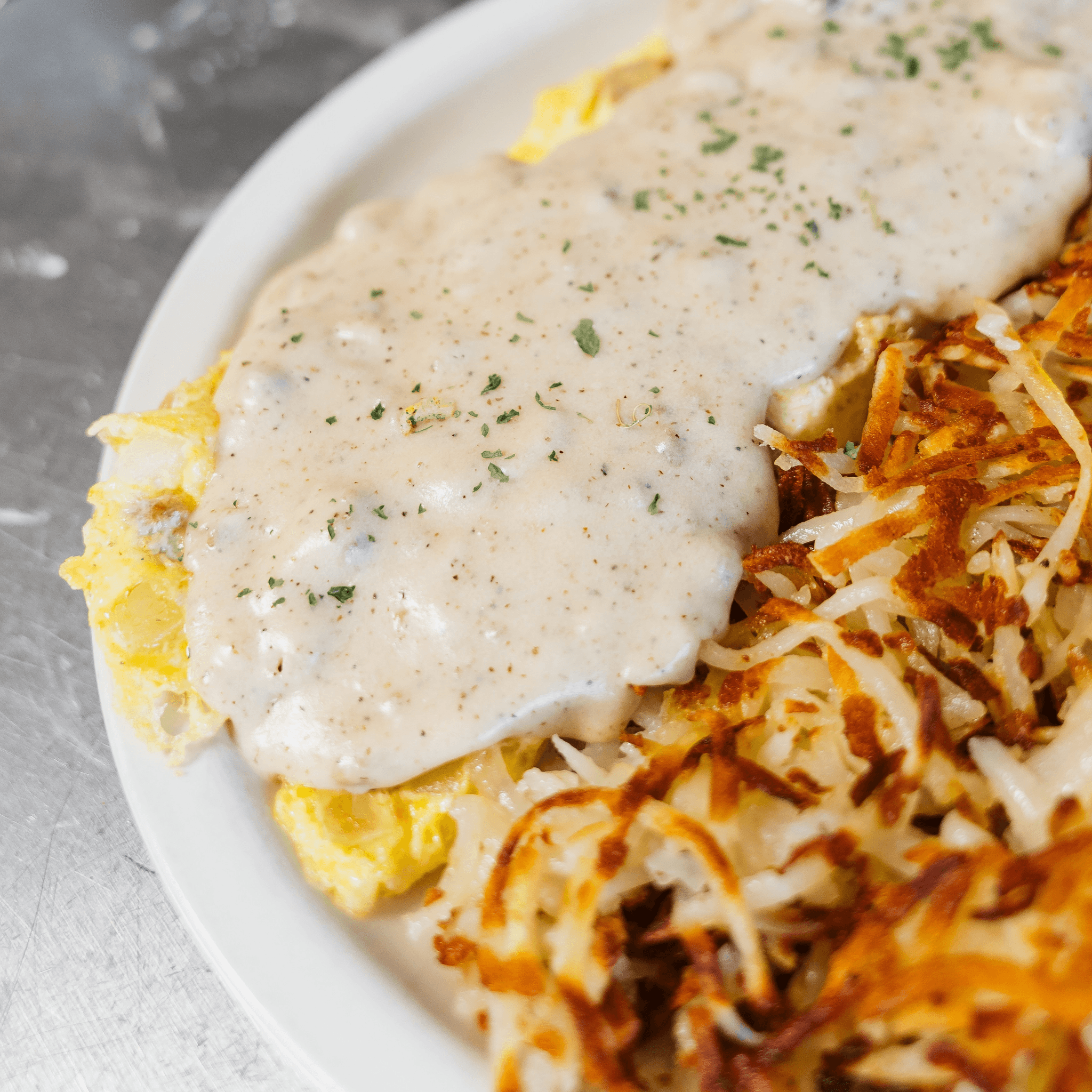 Over-easy eggs atop sausage layered over a biscuit covered in our house-made sausage gravy, served with hash browns