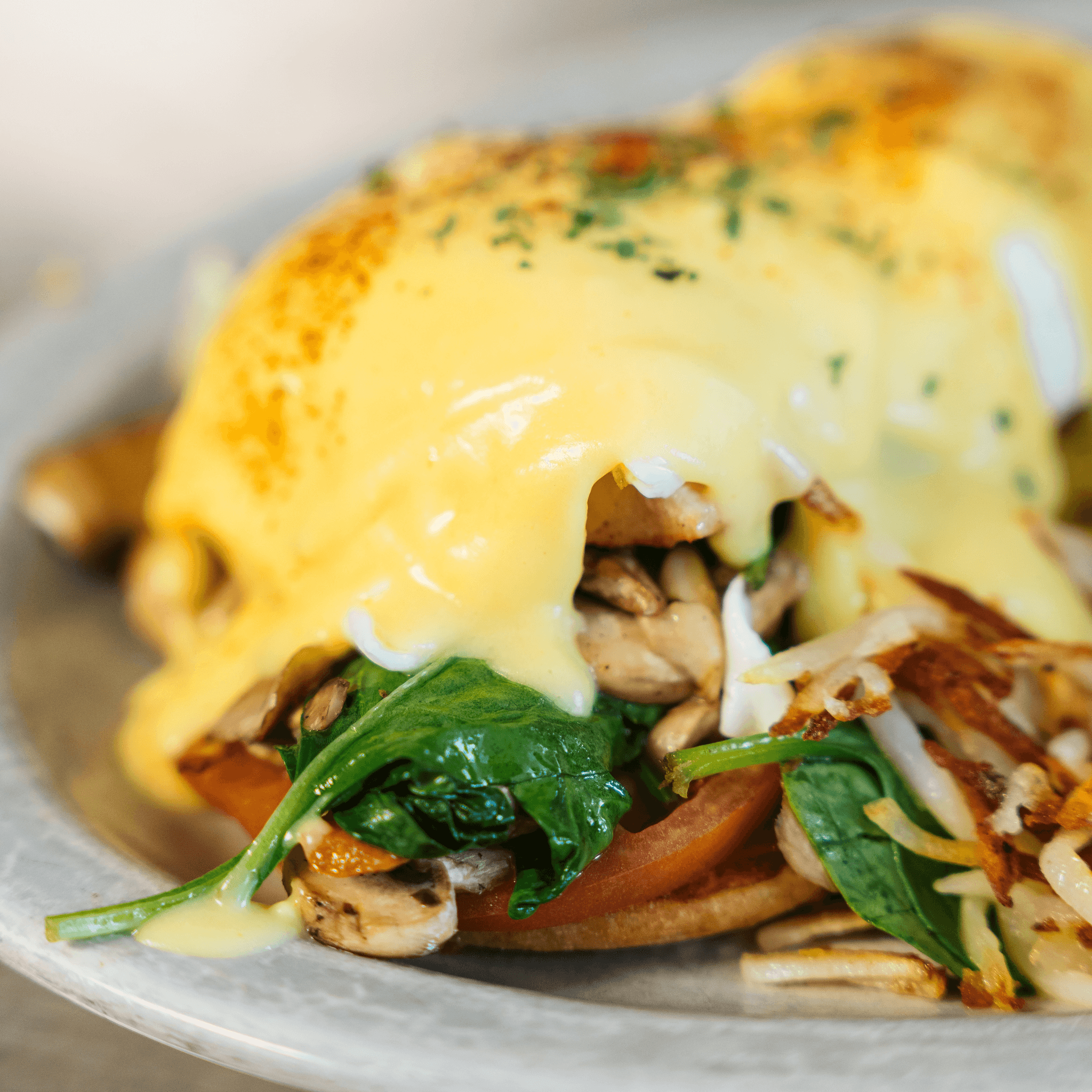 Over-easy eggs on top of a bed of sautéed mushrooms, spinach, and tomatoes over an English muffin topped with hollandaise sauce, served with hash browns