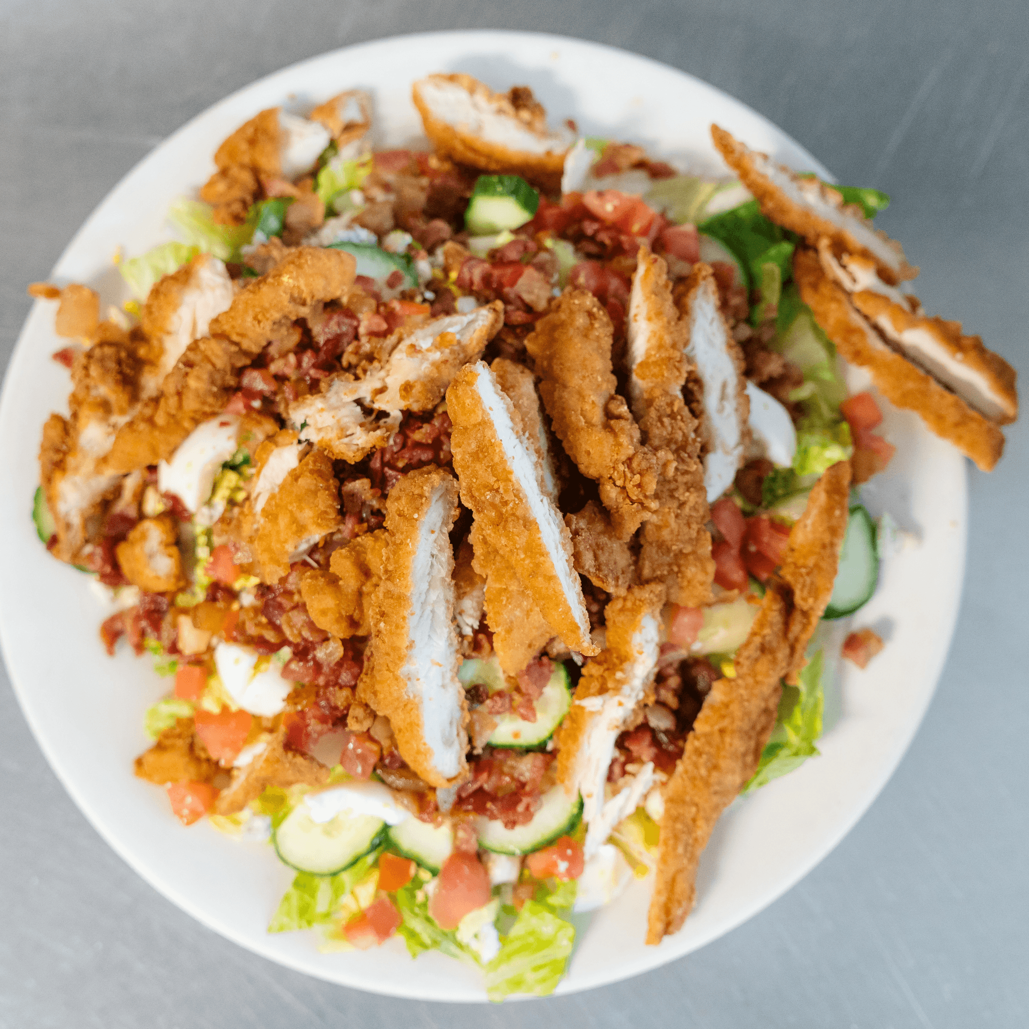 Fried or grilled chicken, bacon, egg, tomato, cucumber, and blue cheese crumbles