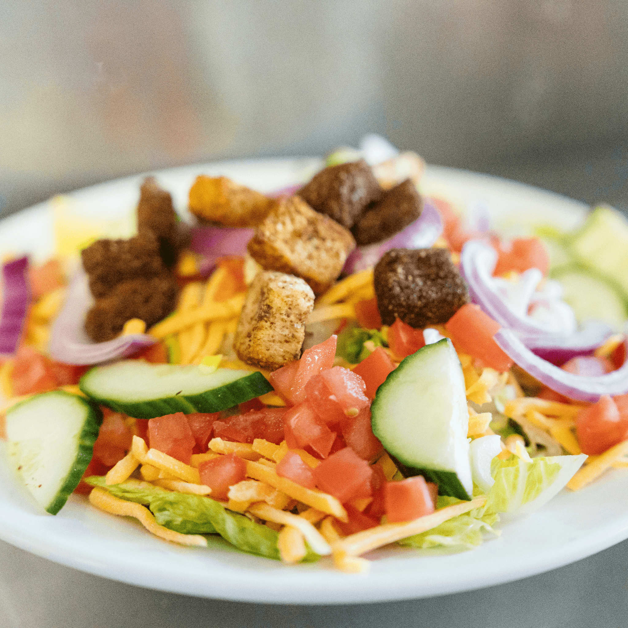 Romaine, tomato, cucumber, red onion, cheddar and croutons. Add chicken for an additional charge