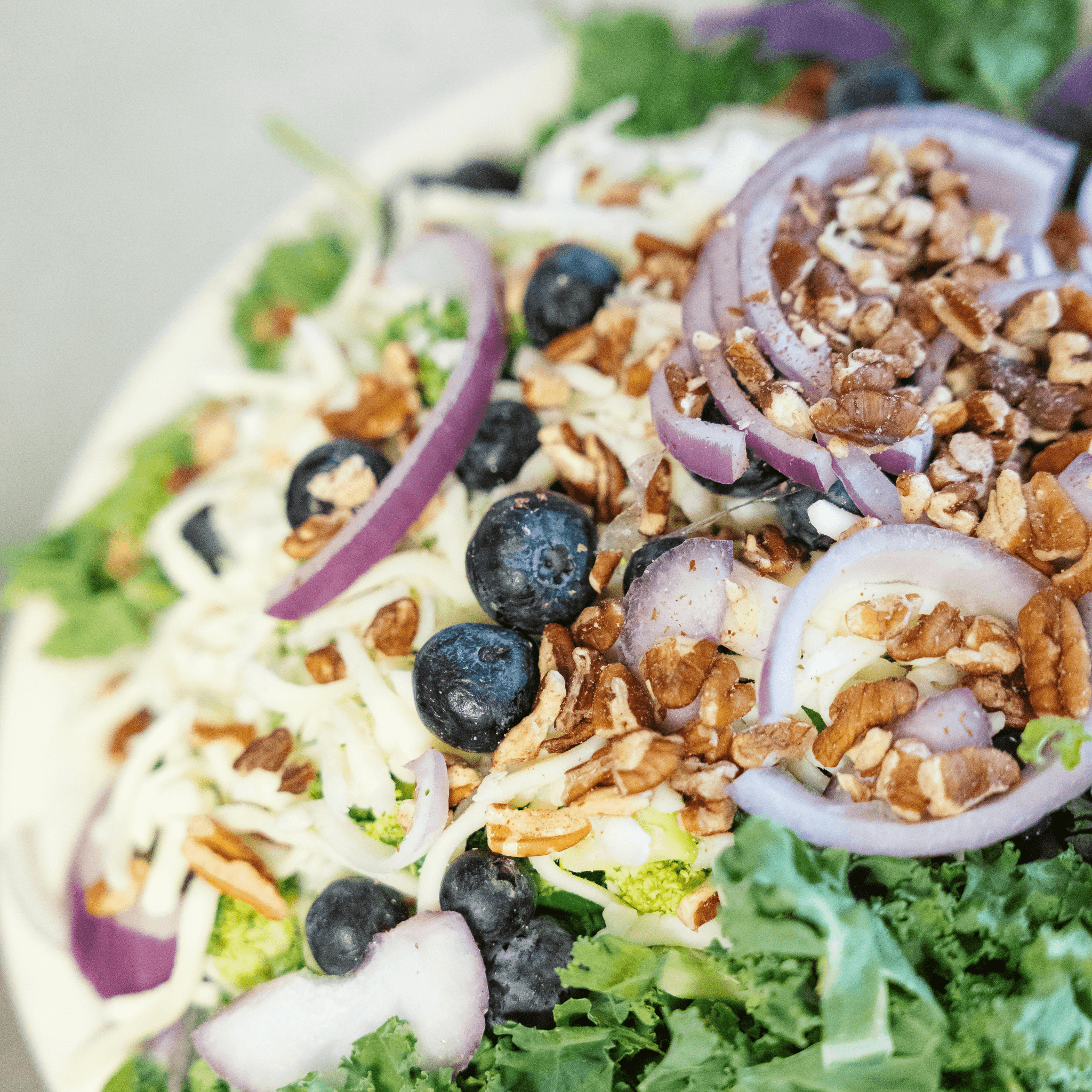 Kale, spinach, broccoli, red onion, asparagus, pecans, mozzarella, blueberries, grilled chicken, tossed in poppyseed dressing.